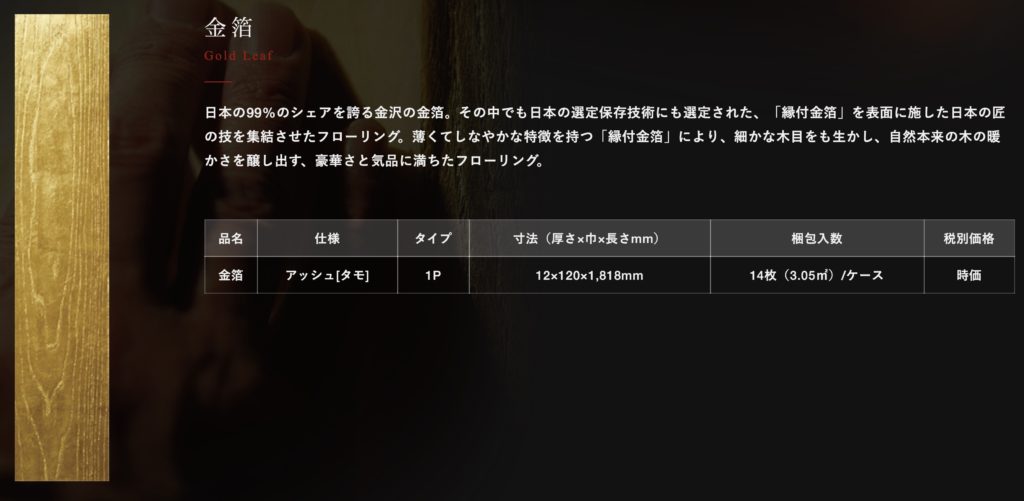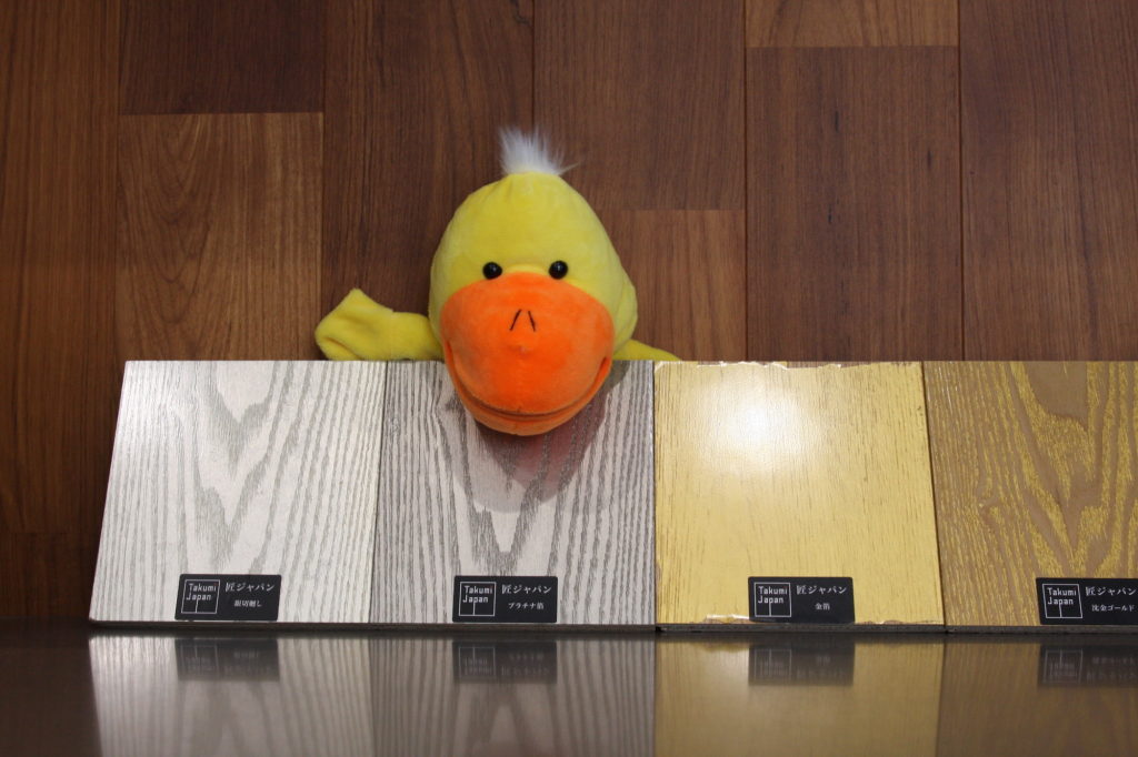ハリー:そちらは染色ではなく、日本の技術を元に作られている「匠ジャパン」というシリーズです。いわゆる「金箔」や「銀箔」と言った伝統工芸の技法がベースとなっています。木の表面を丁寧にこすって年輪を浮き上がらせた浮造り(うづくり)のフローリングに、職人が金や銀、プラチナなどを直接箔押しすることで、豪華で気品あるフローリングが誕生しました。