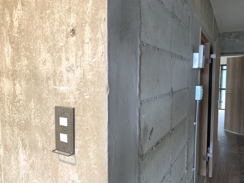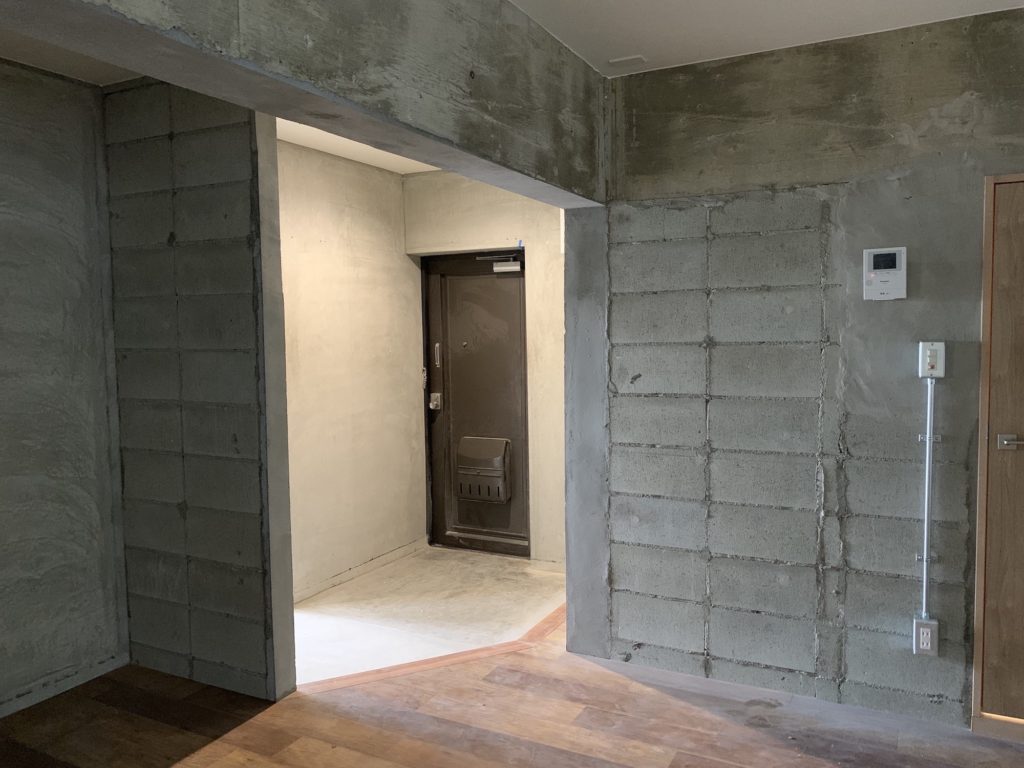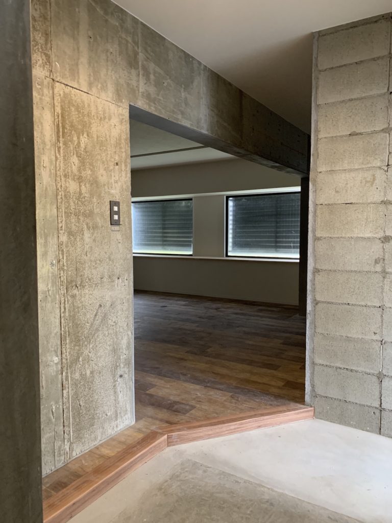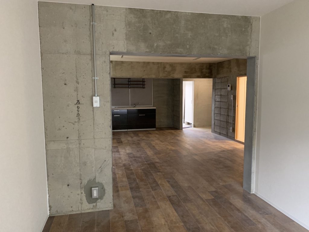 実はこの写真、美装(お掃除)前ではありますが、ほぼ完成したお宅の様子なんです。ブロックや建築時のモルタルはそのままに、ドーンと広いリビングと、見晴らしの良いワークスペース、そして洋室が一つという割り切った間取りのお宅になっています。