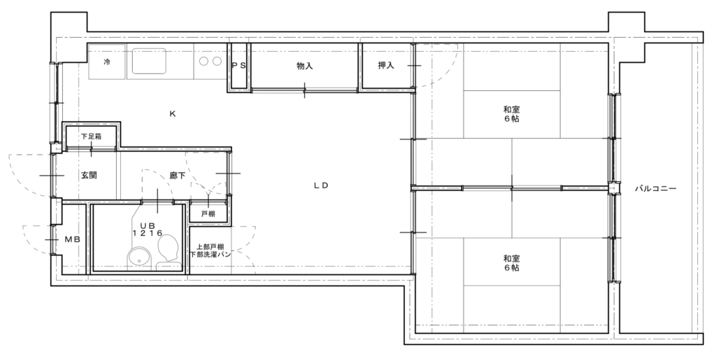 上記が今回オープンハウスを開催させて頂くお宅の「改装前図面」ですが、広さは48平米あるものの、現代の暮らしにはマッチしていません。生活の中心が和室だった時代の名残が強いレイアウトで、しかも使い勝手の悪い3点式ユニットバス(お風呂とトイレと洗面スペースが一体となっているタイプ)のお部屋でした。