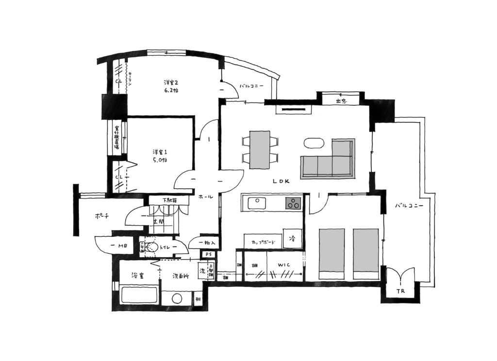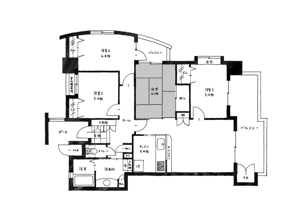 上記が改装前で、下記が改装後の図面です。元々は右側のバルコニー方面へ向けた縦長リビングだったのですが、今後のことを考えて「旧和室と旧洋室3」のゾーンをリビングに変更しました。それに伴って、リビングが使いやすい横長のレイアウトとなり、主寝室とキッチンにはそれぞれの収納スペースを確保することができました。