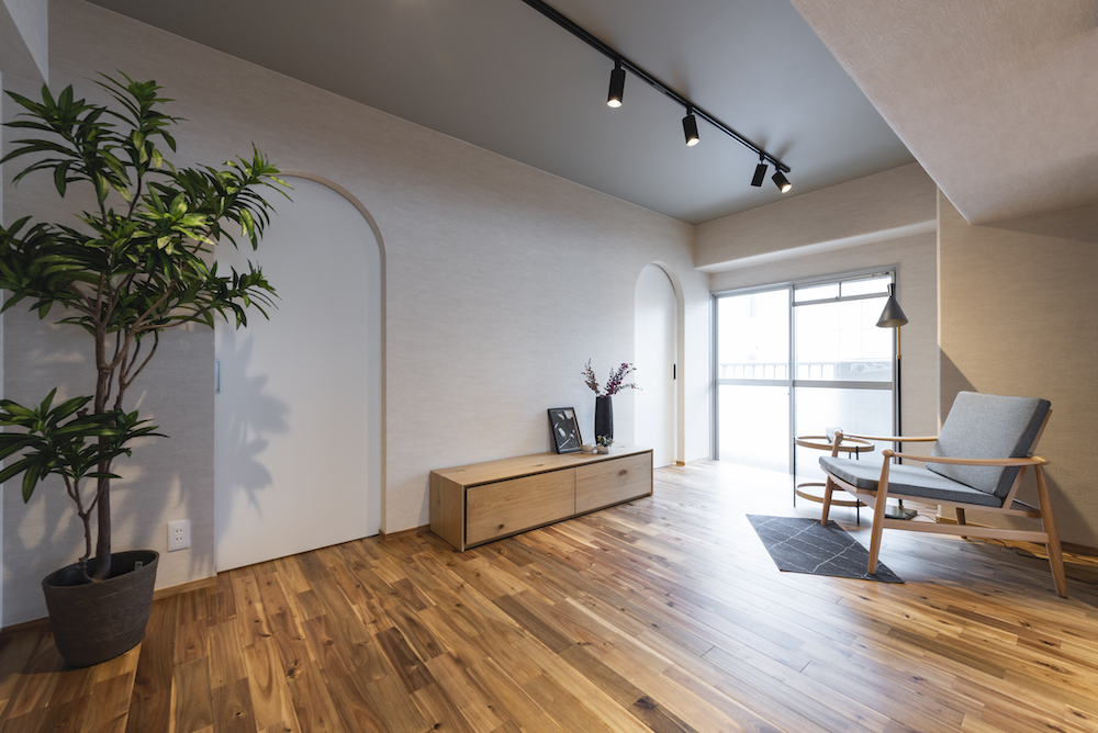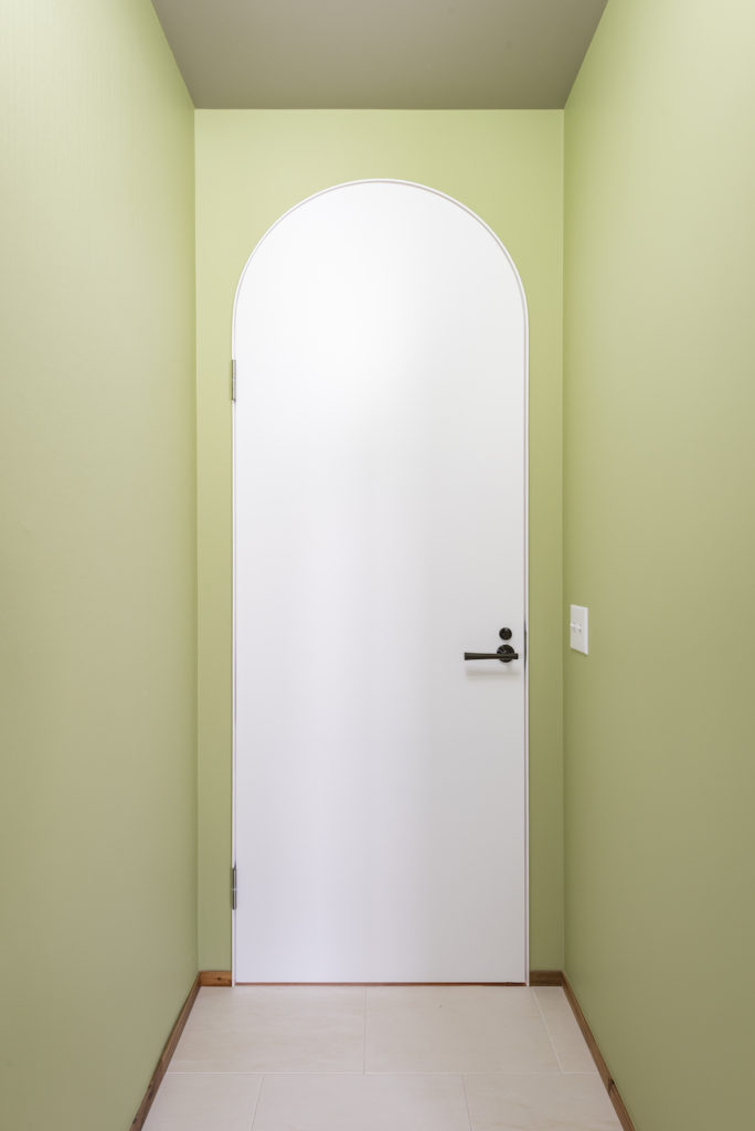 ドアの枠がアーチ型になることでインテリア性を持ち、空間のアクセントになっています。デコレーティブ過ぎる装飾はお家の雰囲気を一変させますが、今回はコストとデザインを両立した空間が完成しました。