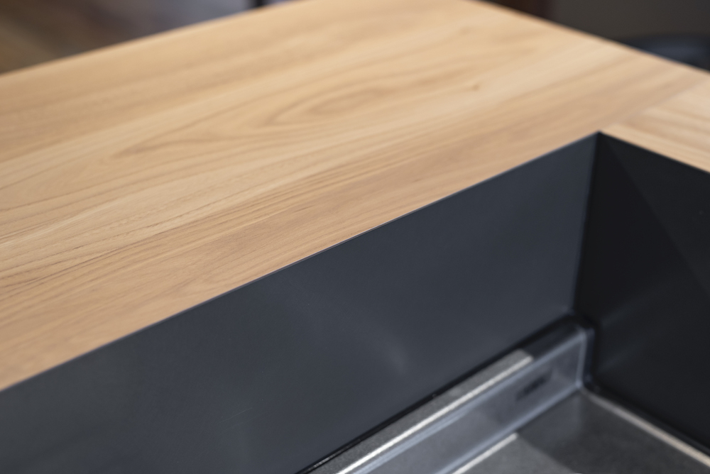そして、こちらが腰壁の近影です。上段の美しい木目と、下段の黒いマテリアルの対比がとっても美しい仕上がりになっています。そんな中で、大工さんの手仕事としてぜひ見て頂きたいポイントは「上段と下段の間の溝」なんです。