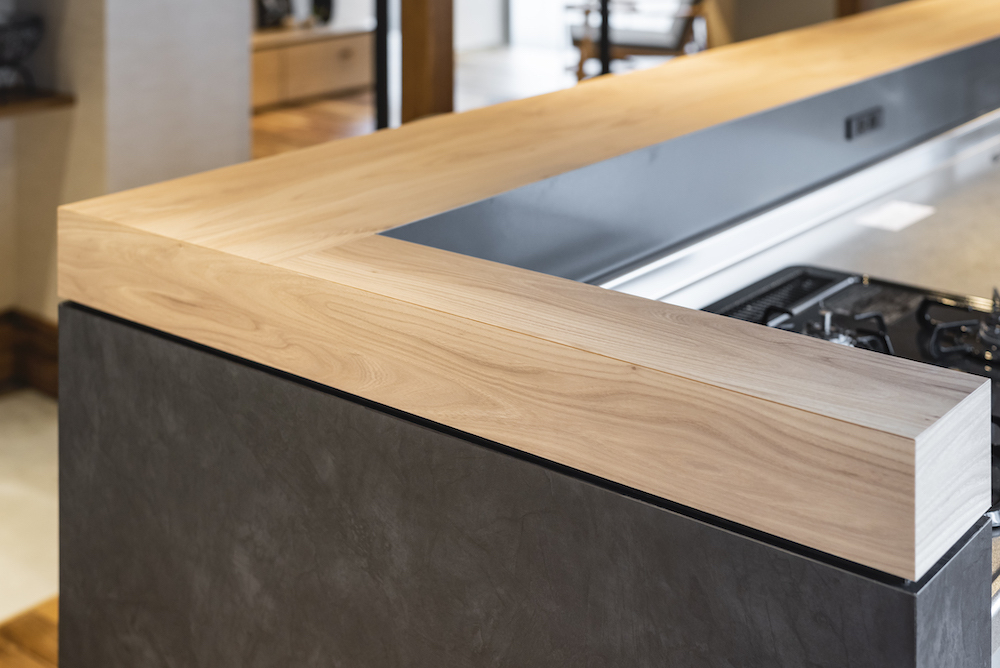 金属製の「見切り」を入れて、上下段のデザインを切り分ける仕上げが一般的ですが、その部分を「溝状」に加工することで陰影が生じ、よりラグジュアリーな雰囲気に仕上がっています。こういった加工もすべて大工さんの手仕上げなんです。