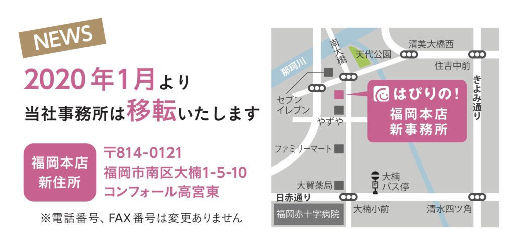 ※ すでにお知らせの通り、当社は2019年12月25日から2020年1月8日まで、年末年始休暇を頂きます。併せて休暇期間内に、当社の本店は福岡市城南区から同南区へと移転いたします。