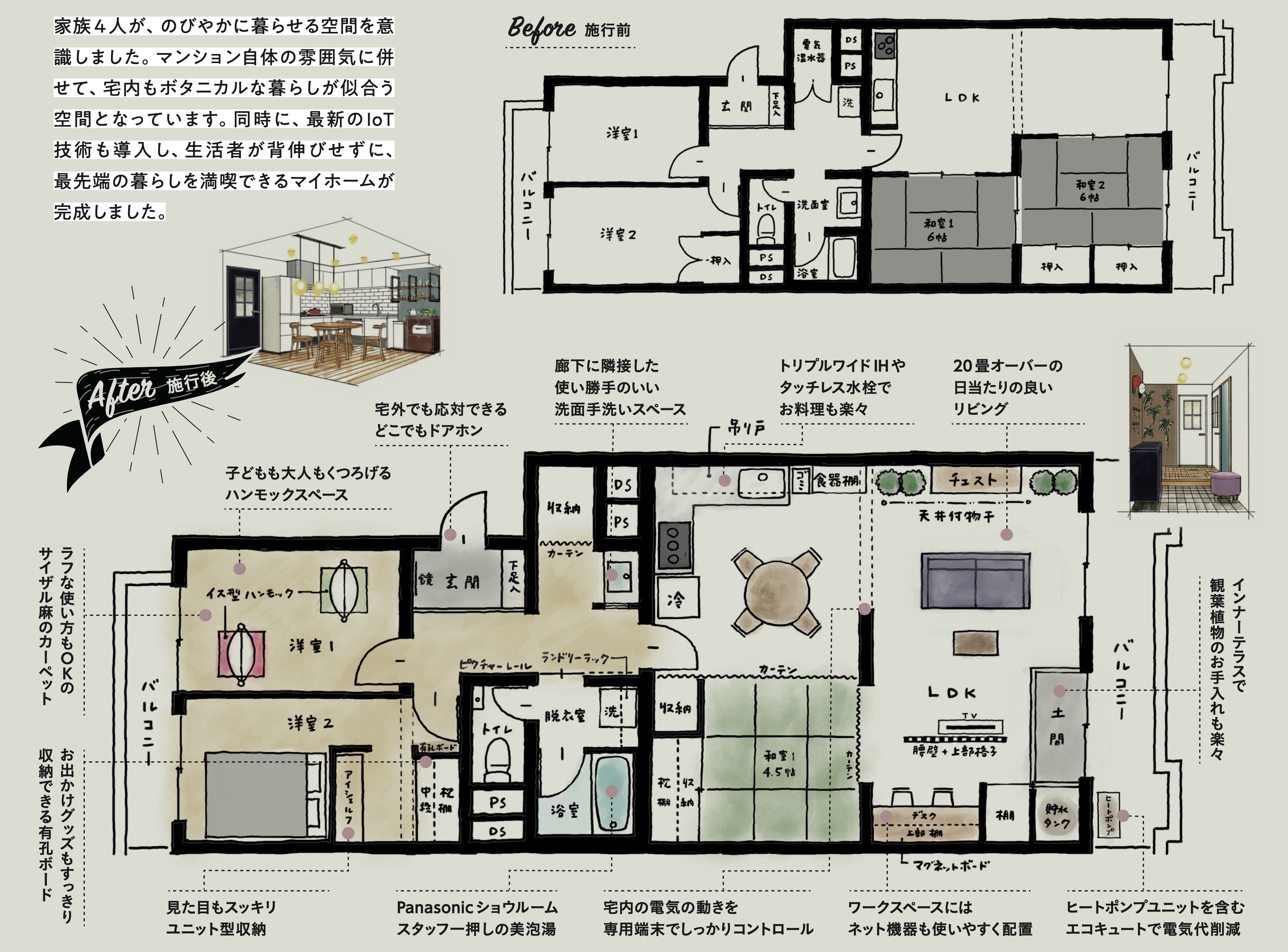 今回のモデルルームは、もちろんこれまで同様にリノベーションの魅力を体感いただける場であるだけでなく、コロナ時代の「ニューノーマルな暮らし」に向けた、たくさんのヒントを詰め込んだ空間となっています。