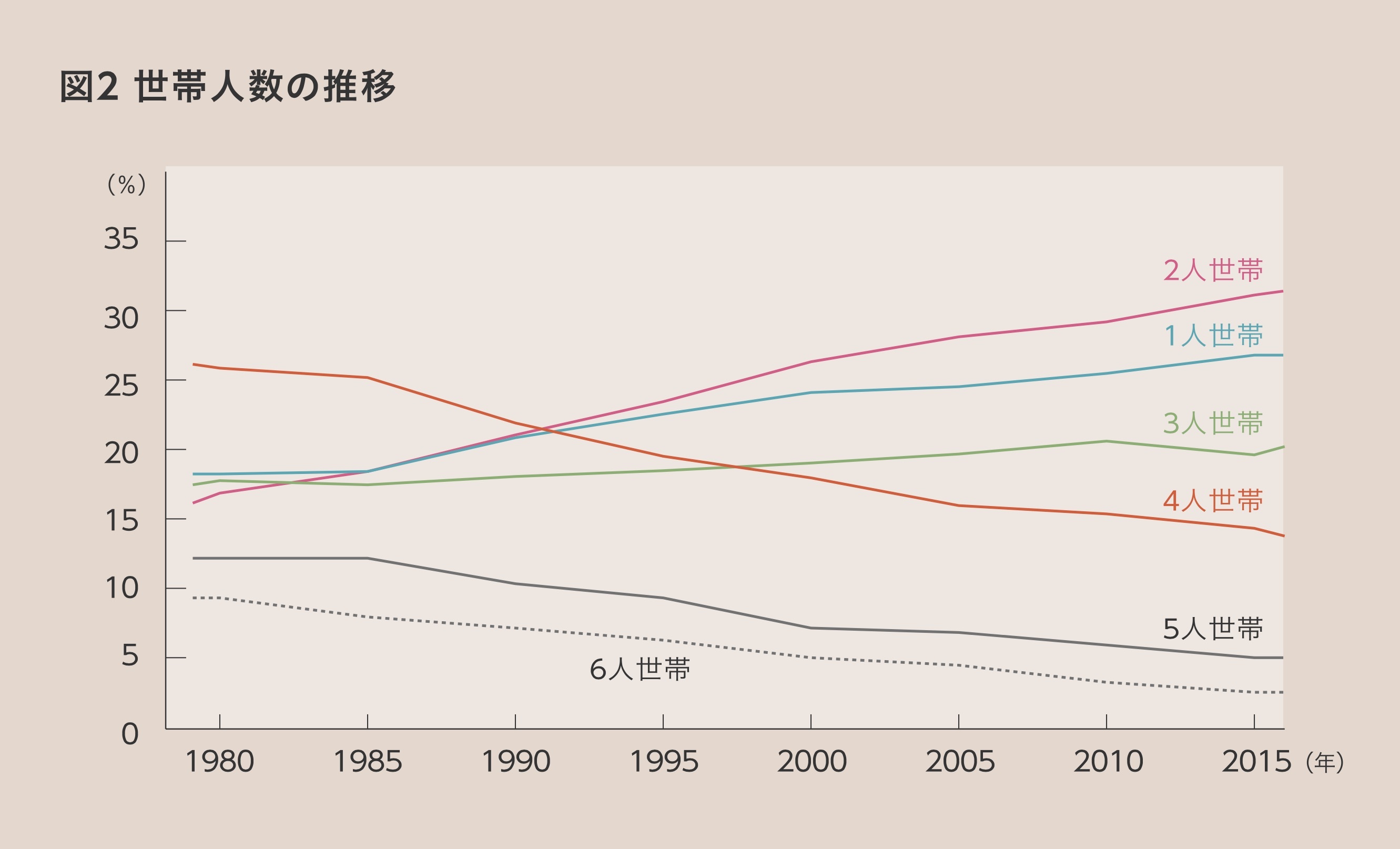 1980年にはトップシェアだった四人暮らしの「ファミリー」は、いまではシェア15%以下の少数派です。日本社会の過半数は、すでに一人または二人暮らしなのです。