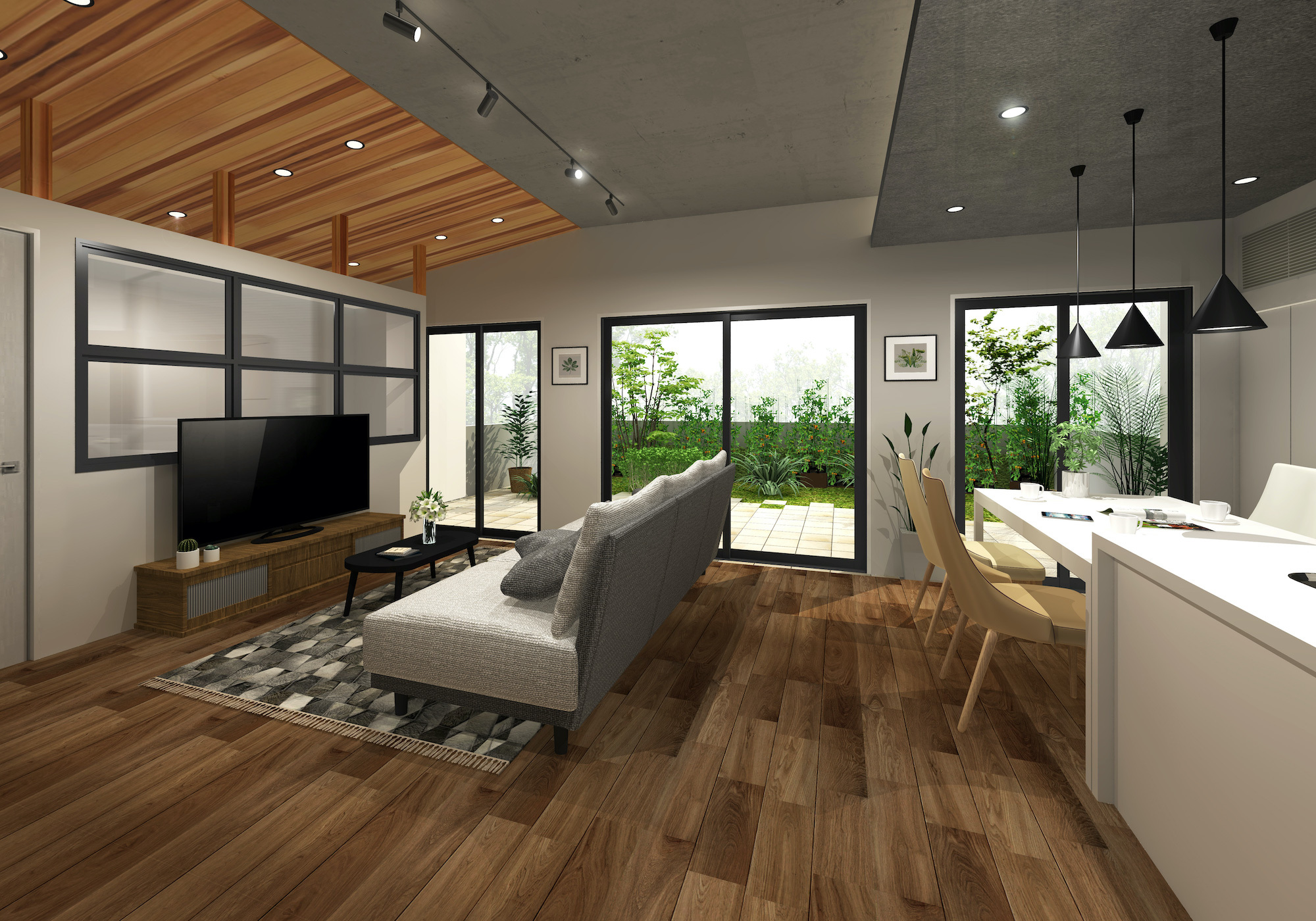 20.8帖のLDKはオトナがくつろげる空間を目指し、元々はバルコニーに面していた3室すべてをリビングとして再配置。しかも、マンションとしては規格外とも言える2.7mの天井高を生かして、間接照明や天井用木材を活かした立体的な設計を行いました。