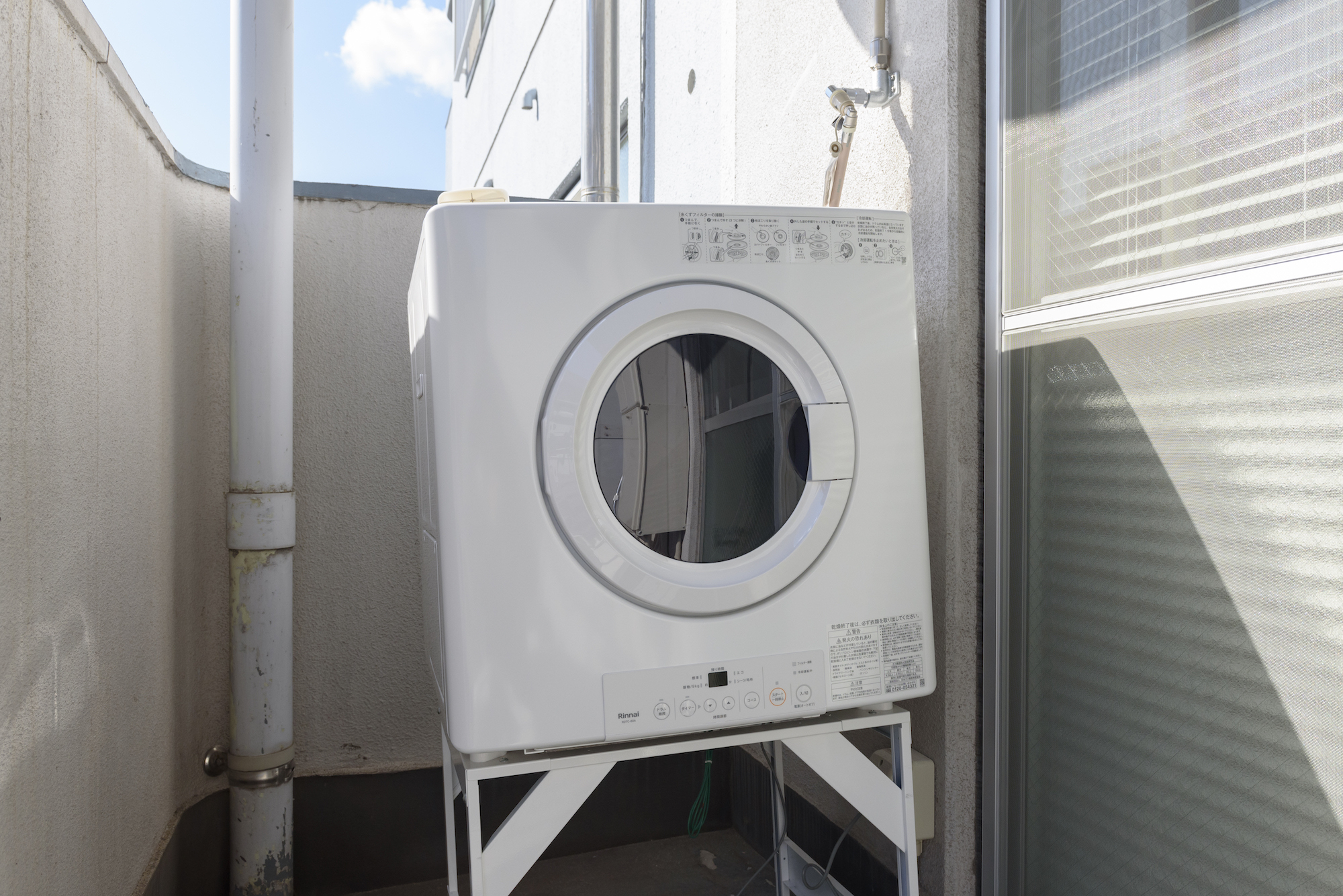 きちんとマンションの管理組合にも許可を取り、今回はガス式の衣類乾燥機をバルコニーに設置させて頂きました。ガスと電気の配管があれば、実は架台に乗せて外に設置することも可能なんです。