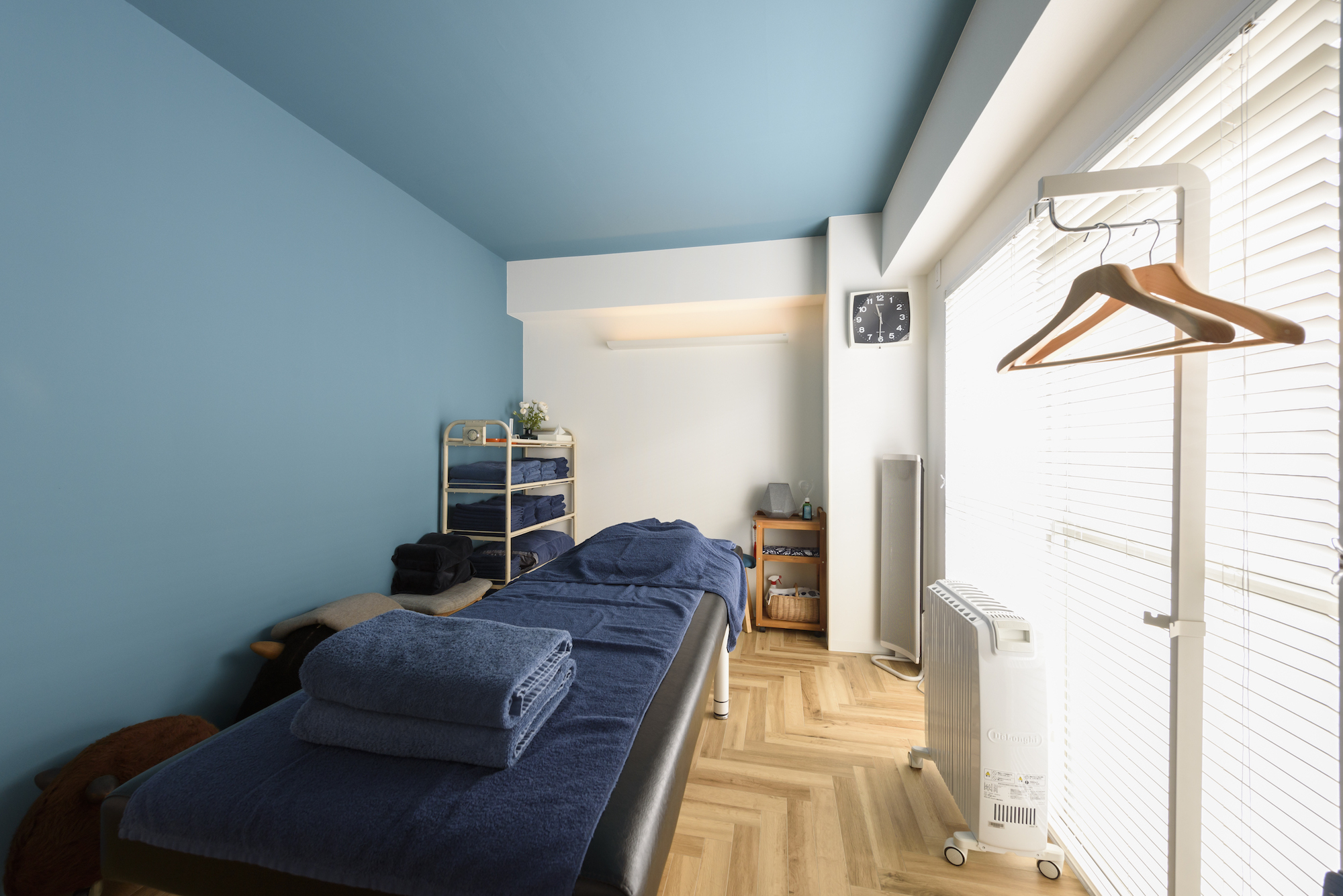 一方の施術スペースは、ブルーのクロスと濃紺のタオルの色合いもあり、落ち着いた雰囲気に仕上がっています。美容室やサロンなどでは、毎日たくさんのタオルを利用しますよね。そんな時に役立つのが、こちらのカンタくんです。
