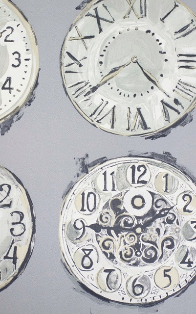 明るいグレーの「時計」の壁紙。そして、ベッドが置いてある主寝室には…