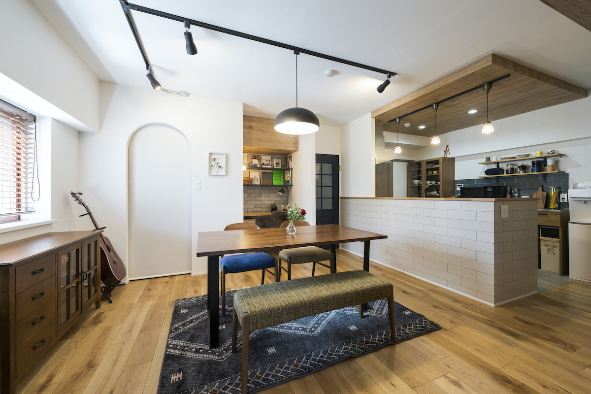 お客さまのこだわりが随所に詰まった空間。その中でも素材の質感や配色は、何度も打ち合わせを重ねて決定いたしました。