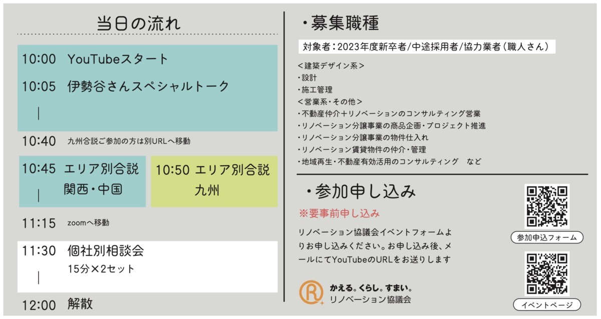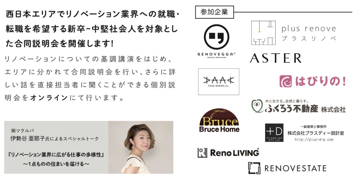 リノベーション業界への就職・転職を希望する「若手・中堅社会人向け」の合同イベントで、なんと関西・中国・九州の全22社が一堂に参加する就活フェアとなっています。