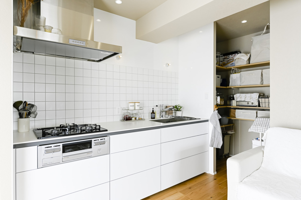 その一方でキッチンは、ホワイトで統一された爽やかな空間。壁面のタイルとペンダントライトが相まって、上品な印象を与えています。