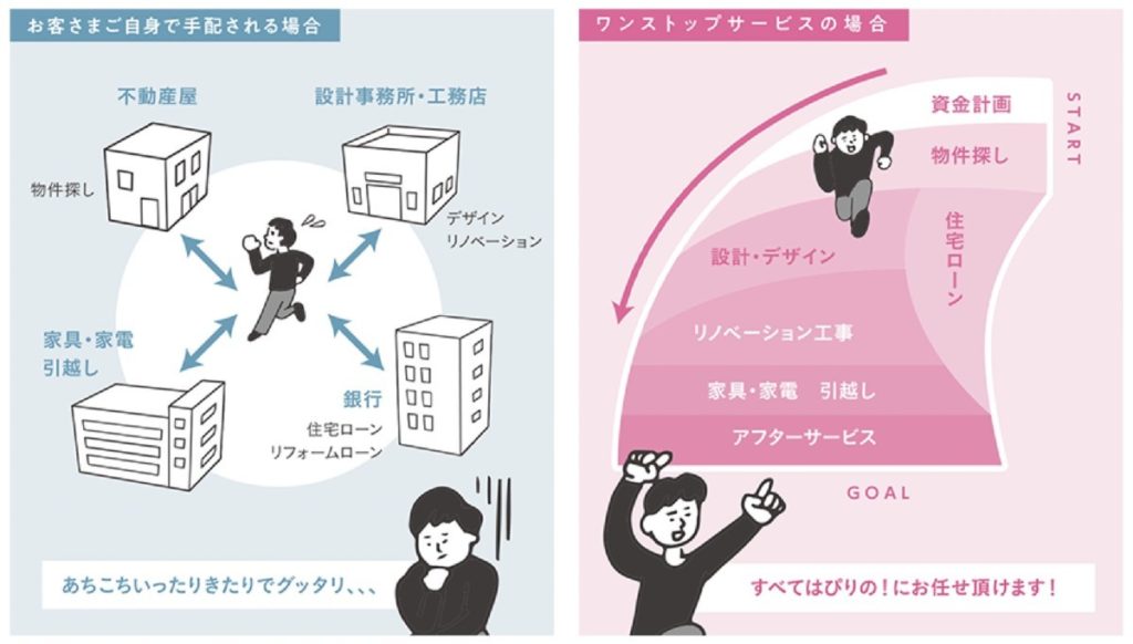 その専門性の違うプロが、一組のお客さまに「家探しから、リノベーションまで」をご提供するのが、いわゆるワンストップサービスです。