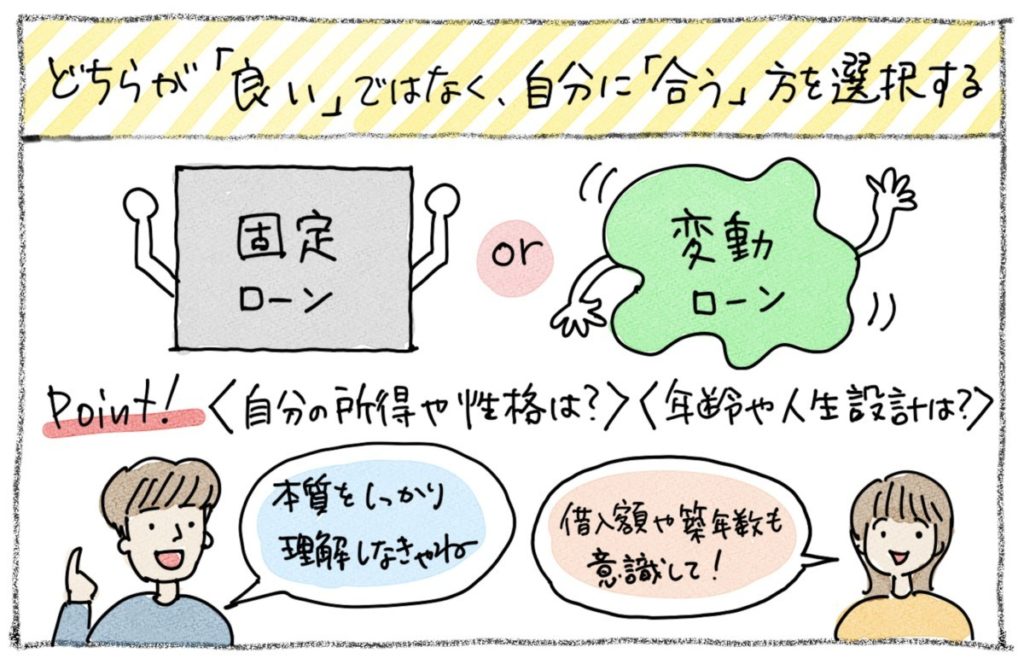 結局のところ、物件が決まってから「変動がいいか、固定がいいか」と検討するのではなく、マイホーム購入を考えた時点で「ご自身の所得や考え方に基づいて、早めに判断しておく」ことがベターな進め方と言えます。