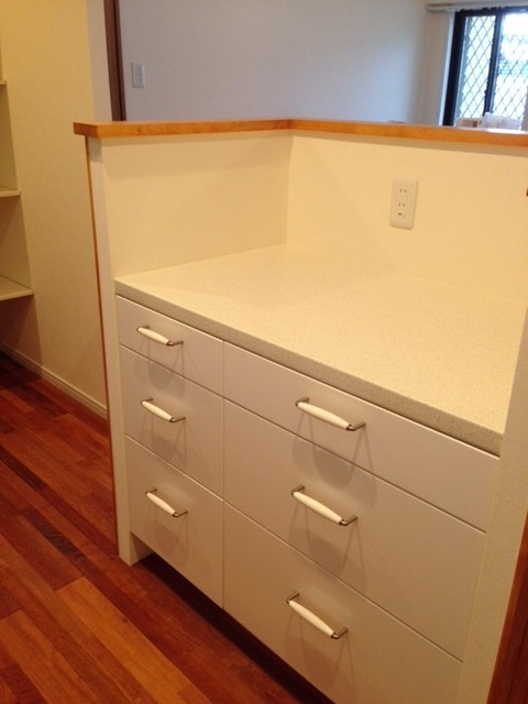 たとえばコチラのキッチンカウンター。購入された物件の間取りだとL字型キッチンで電子レンジやジャーなどの調理器具が置きにくかったので、カウンター兼収納兼作業台としてキッチンの対面に設置することに!しかも、カウンターの下部(床下に向かった部分)にはローラーを付けて、奥さまが押しても簡単に動くようにしました。