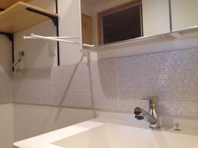 こちらはタオル掛けがIKEA製品です。サンワカンパニーの優しいタイルとの相性もピッタリですね!
