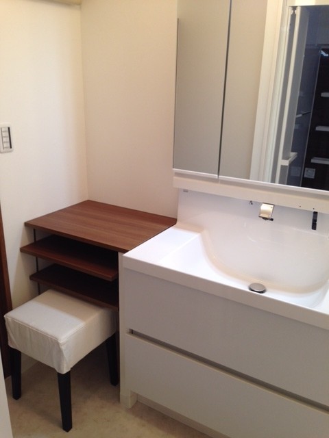 こちらの写真内で使っているIKEAのアイテムはスツール(イス)です。洗面の休憩用に使うイスが欲しいとお客さまが言われていたのですが、幅が狭い脱衣所で大きなイスだと使い勝手が悪くなってしまいます。そこで、IKEAのスツールに合わせて収納を造作し、省スペース&予算カットしながらもご要望を満たす仕上げになりました。