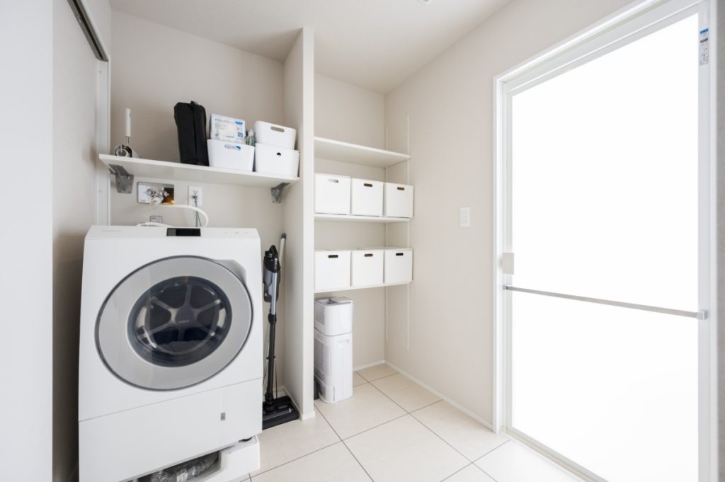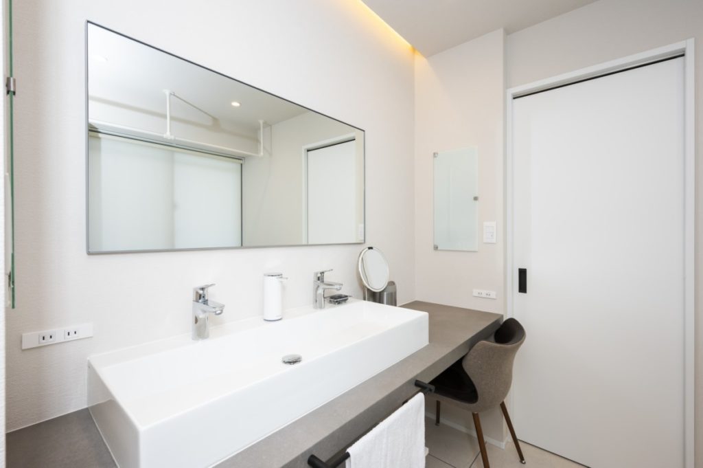玄関から洗面、脱衣室は、リビングを経由しない回遊導線を確保。椅子も置ける広い洗面で、機能性と実用性を兼ね備えた空間になっています。