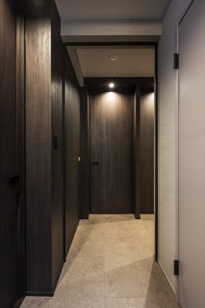 書斎や寝室へと続く廊下は、各部屋の入口扉前にダウンライトを配置しています。わざと照度を落とした空間デザインと相まって、まるで高級ホテルのような佇まいに。