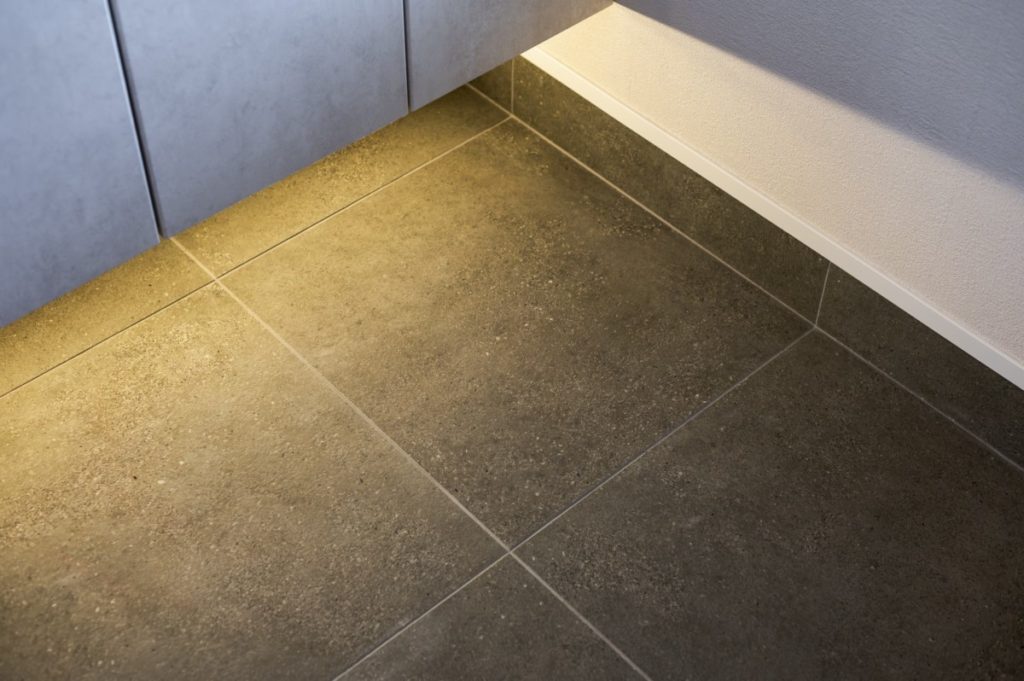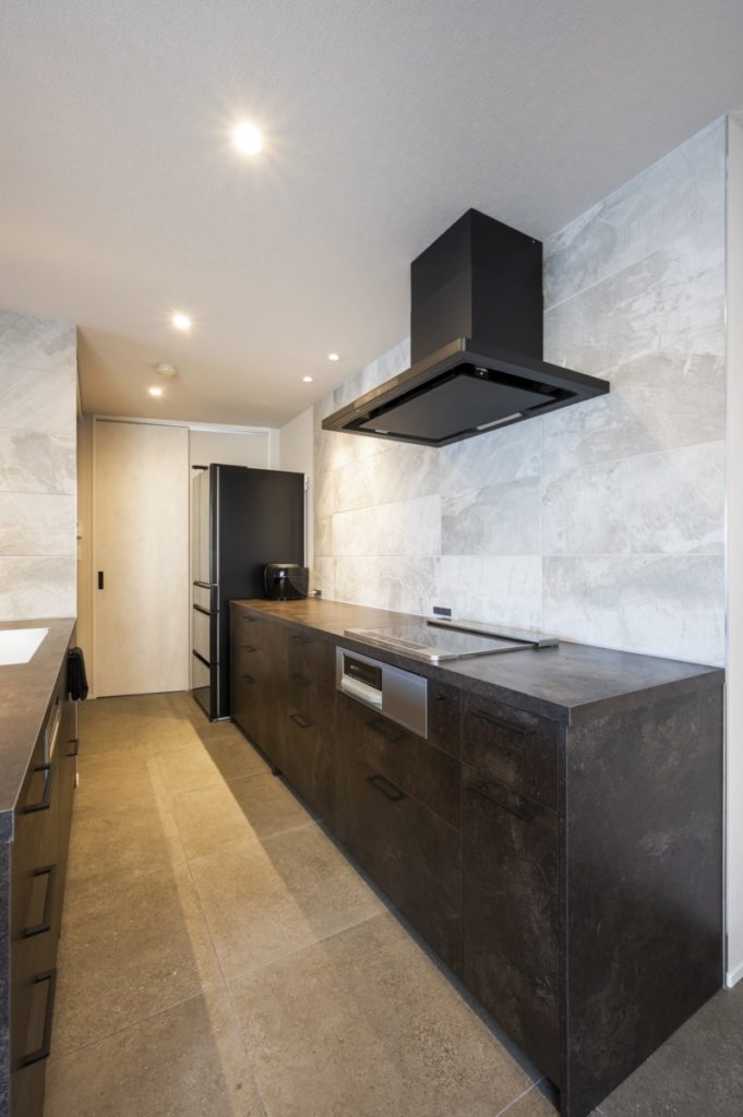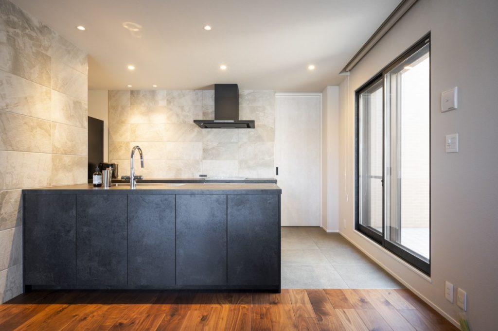 LDKで一番目立つキッチンを先に決めることで、部屋全体の空間づくりの方向性が定まります。キッチンの壁や床には、大判のタイルを選定。グラフテクトの色や素材感と相まって、高級感を高めてくれます。