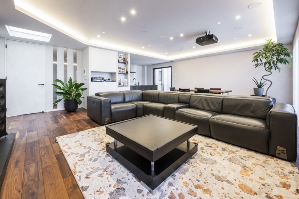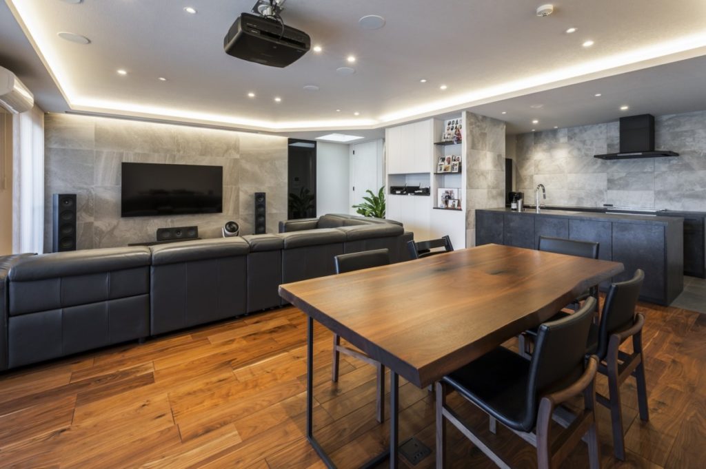 ダイニングテーブルも同系色を選定し、椅子やソファーなどの家具も黒で揃えることで、LDK全体に統一感が生まれました。間接照明とダウンライトがさらにムードを高め、ラグジュアリーな空間となっています。