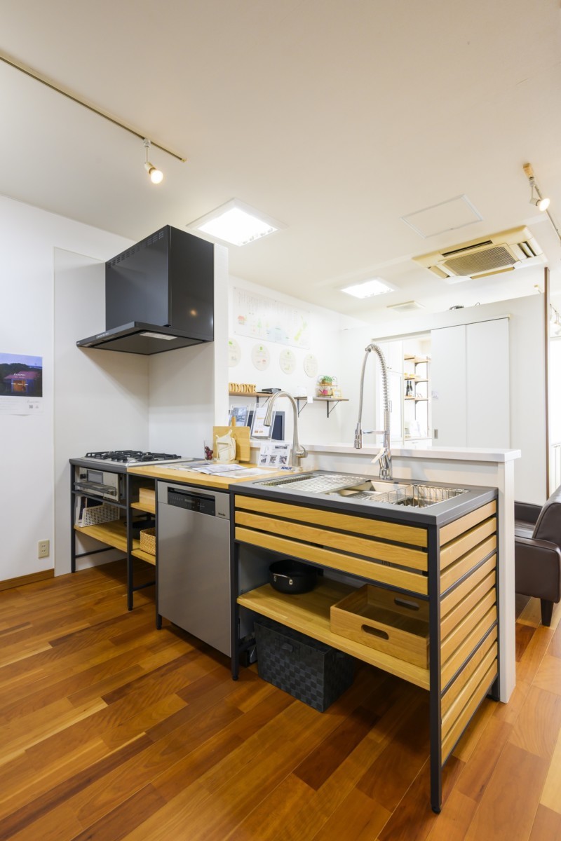 福岡のショールーム「ウッドワンプラザ博多」は、博多駅から福岡空港へと向かう幹線沿いにあります。コンパクトな会場ながら、無垢材を活かしたフローリングや室内ドアだけでなく、キッチンや洗面台、収納向けアイテムなども多数設置されています。