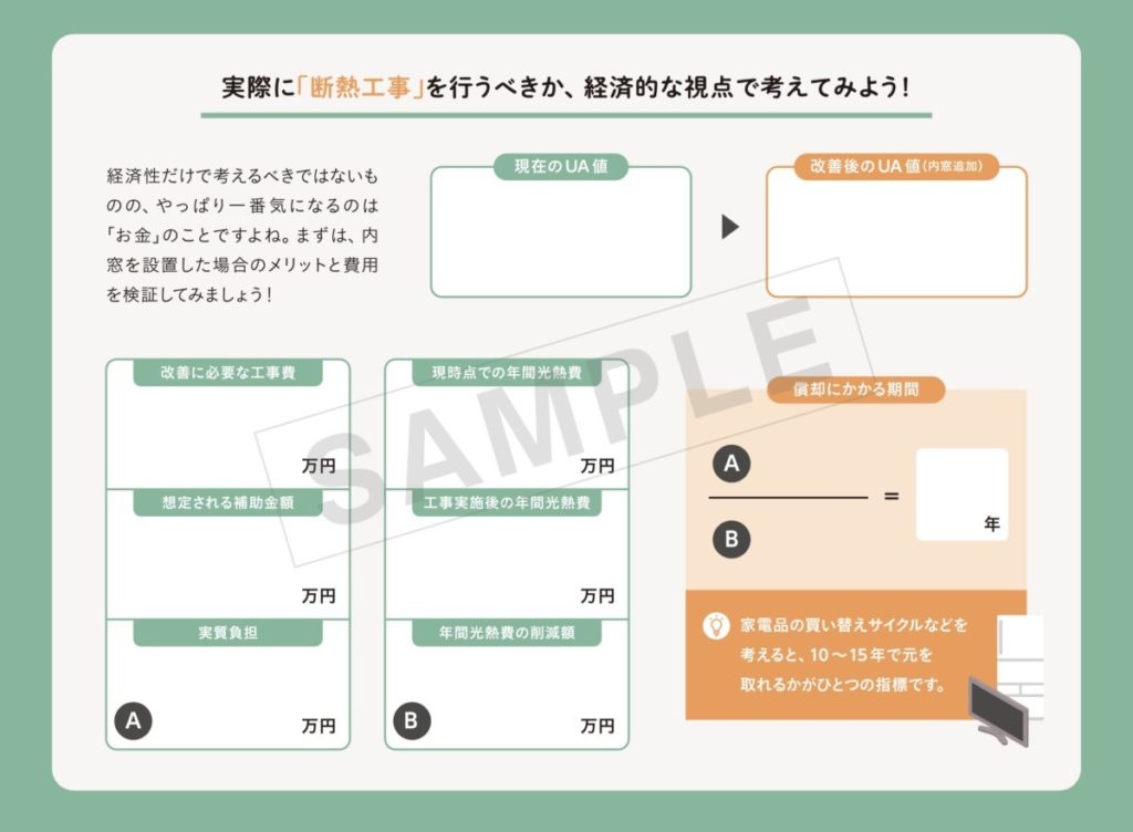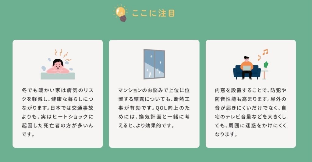 部分的なリフォームではなく、家全体をリノベーションする機会だからこそ、断熱工事(内窓をつけるだけ)でどれだけQOLがアップするのか、そしてその費用がいくら必要で、補助金がいくら支給される予定なのかを「見える化」することが有効です。