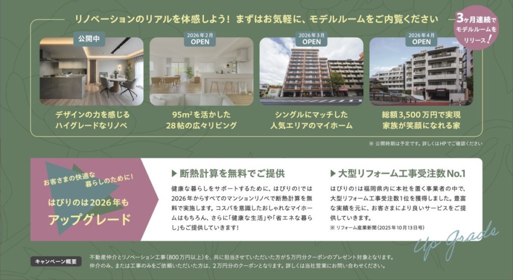 また、年明けには公開中の百道浜だけでなく、西新、高宮、箱崎などに続々モデルルームがオープンします!福岡でもっともリノベーション実績の多い当社だからこそ、さまざまなタイプの空間を見ていただけるよう準備中です。