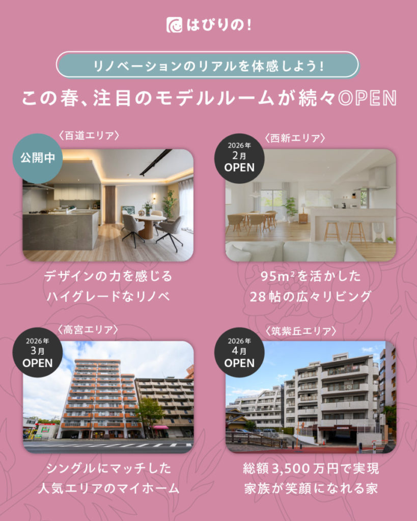 続いて1月31日から公開予定の物件では、28帖のリビングを持つ広々とした空間をご体感いただけます。その後も、人気の高宮エリアにシングル向け1LDK、筑紫丘(大橋)エリアに総額3,500万円で実現した「子育てファミリーにマッチした予算感」のマイホーム、そして急速に注目が高まっている箱崎・貝塚エリアの大規模マンションなど、3ヶ月連続でさまざまなモデルルームをご用意しています!