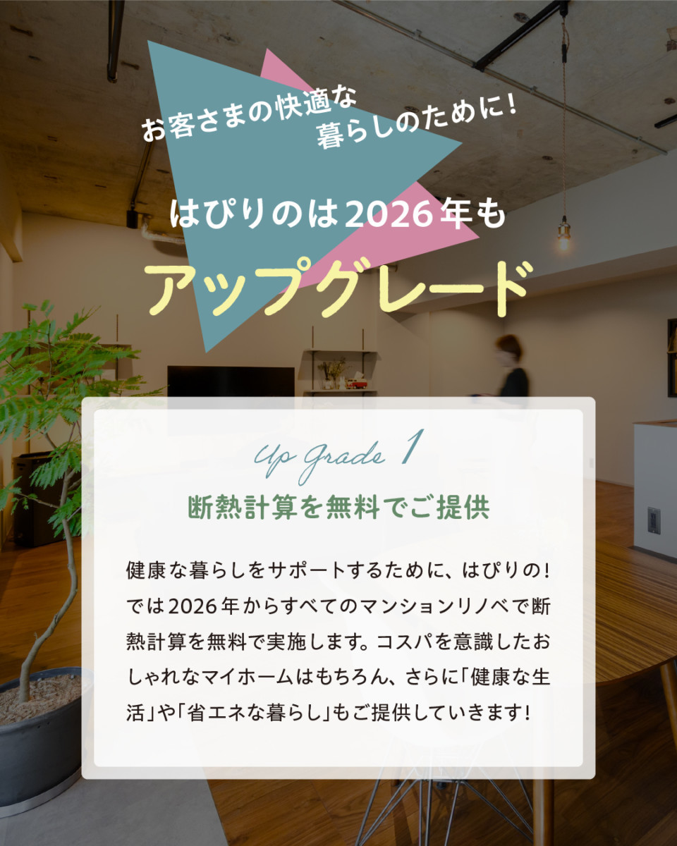 そこで、はぴりの!では2026年1月からすべてのマンションリノベーションで断熱性能を無料で数値化。経済性と住み心地のバランスを、数値に基づいて検証していきます。当社が得意としていたデザイン性とコスパの両立はもちろん、健康な暮らしもサポートさせていただくきます。