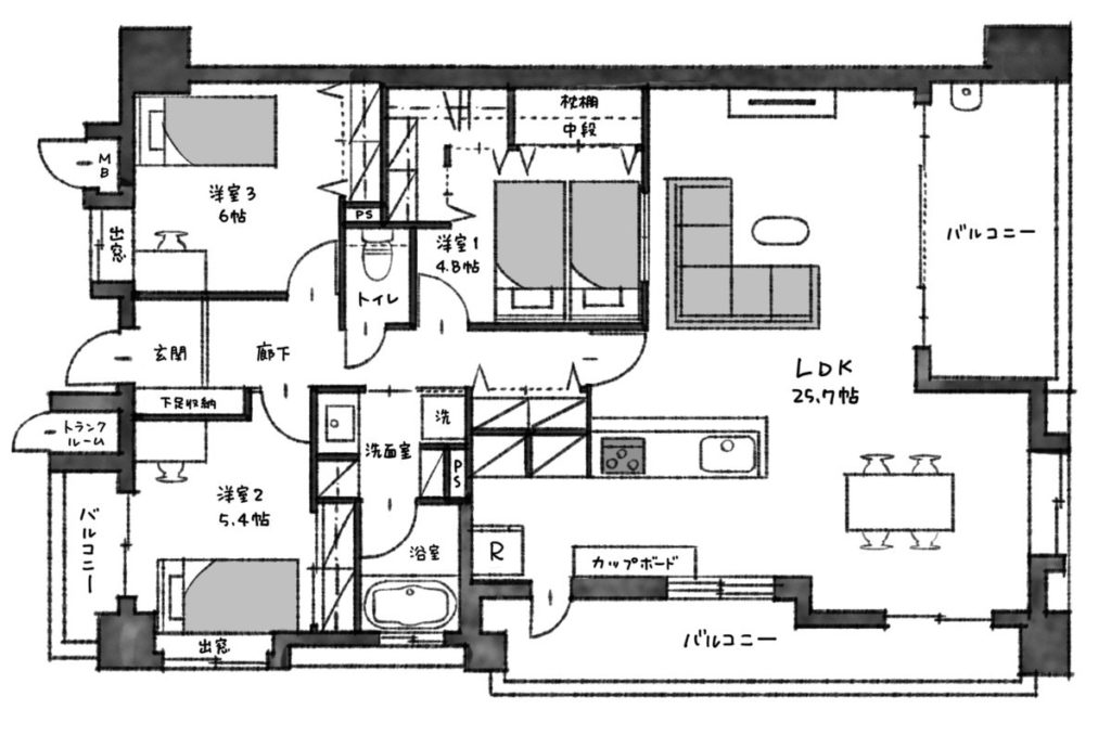 新築マンションの平米数は、土地と建築費の高騰でどんどん狭くなっています。都心部では3LDKでも60㎡台が普通ですし、80㎡の広さがあれば4LDKで販売されることが一般的です。