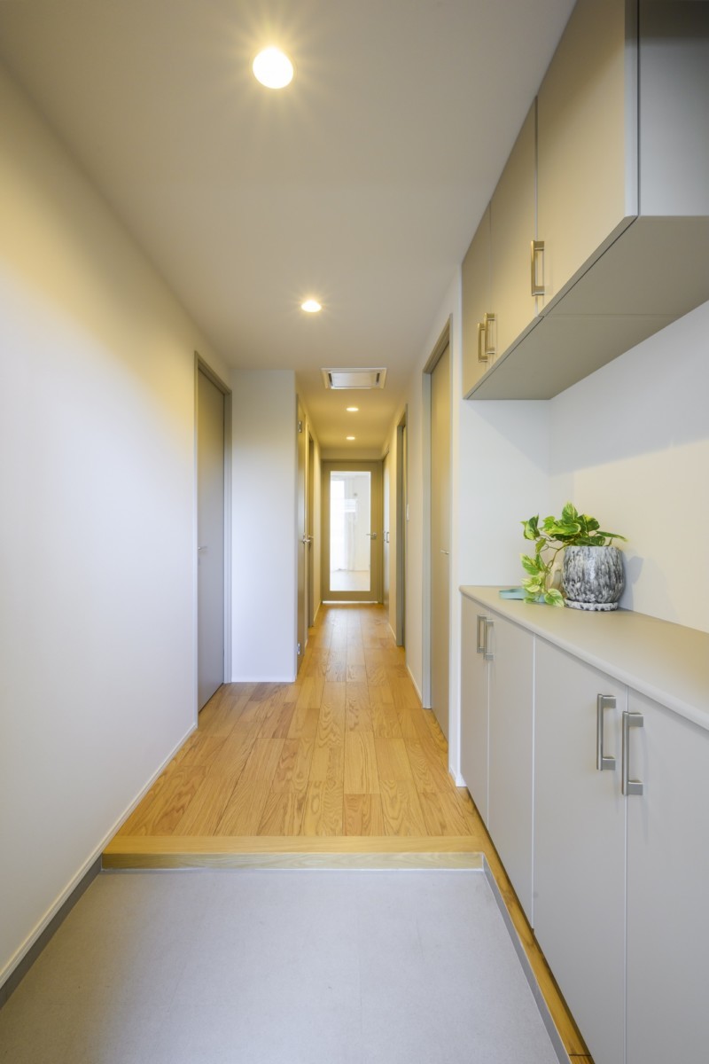 宅内のテイストはナチュラルモダンに統一。建具も人気のウォームグレー色を採用することで、オークのフローリングとマッチした空間が誕生しました。もちろん、福岡でリノベーション実績多数の当社ならではの「デザイン性」と「コスパ」を両立するアイデアも、たっぷりと取り入れた現場です。