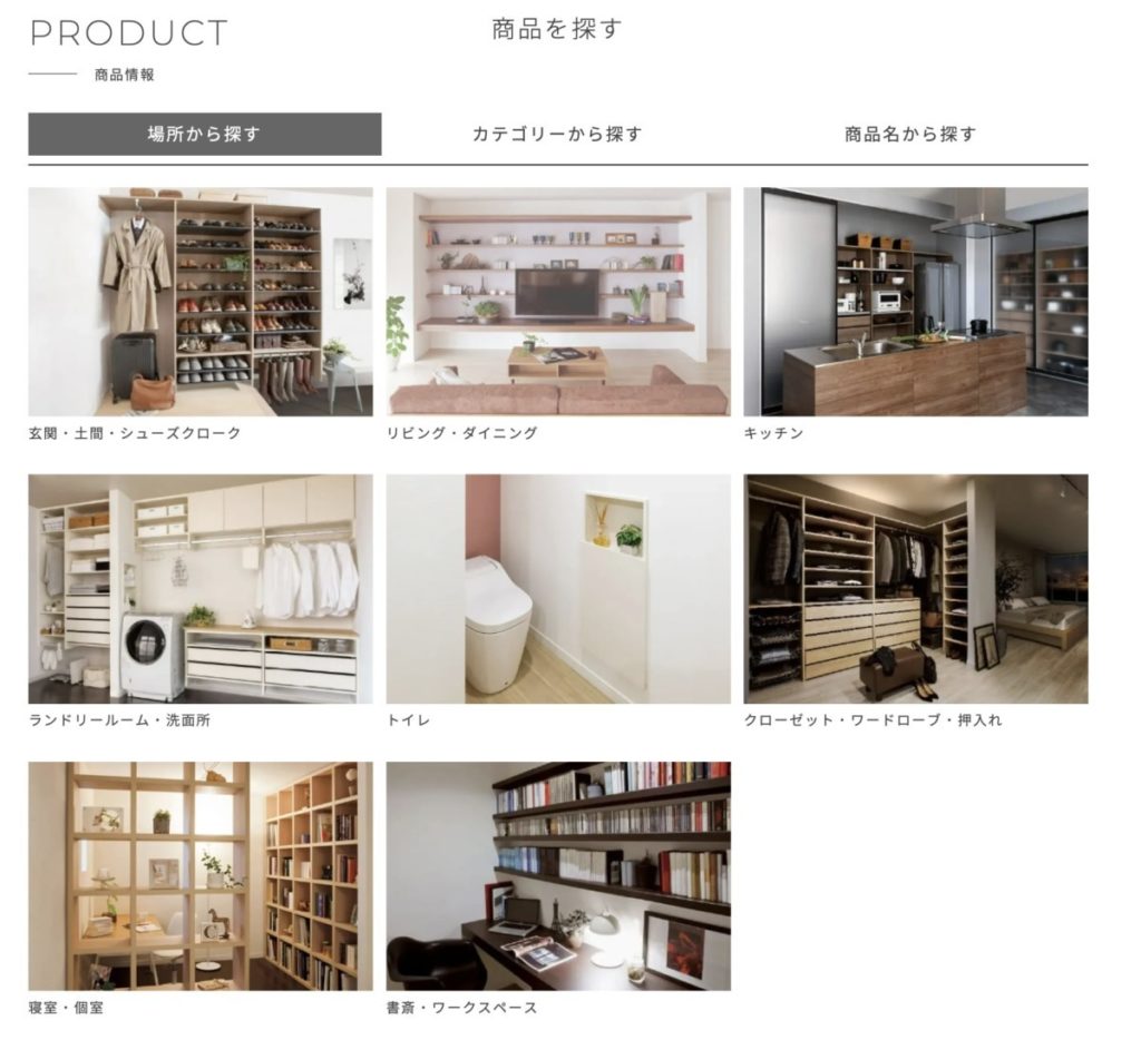 リビングやキッチンなどの見せる収納、玄関や洗面台などの実用性を高める収納、ニッチを上手に活用するディスプレイ収納など、たくさんのアイデア製品が揃っています。ホームセンターでは山崎実業などが人気ですが、それよりもうちょっとプロ仕様の建材メーカーという立ち位置です。
