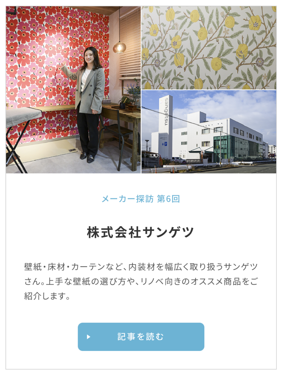 ちょうど、当社の人気コンテンツ「新米くん」のインタビューでも、サンゲツの植山さんからクロス選びのポイントや現在のトレンドを聞いたばかりです。下記画像にリンクを設定していますので、この機会に併せてご覧ください。