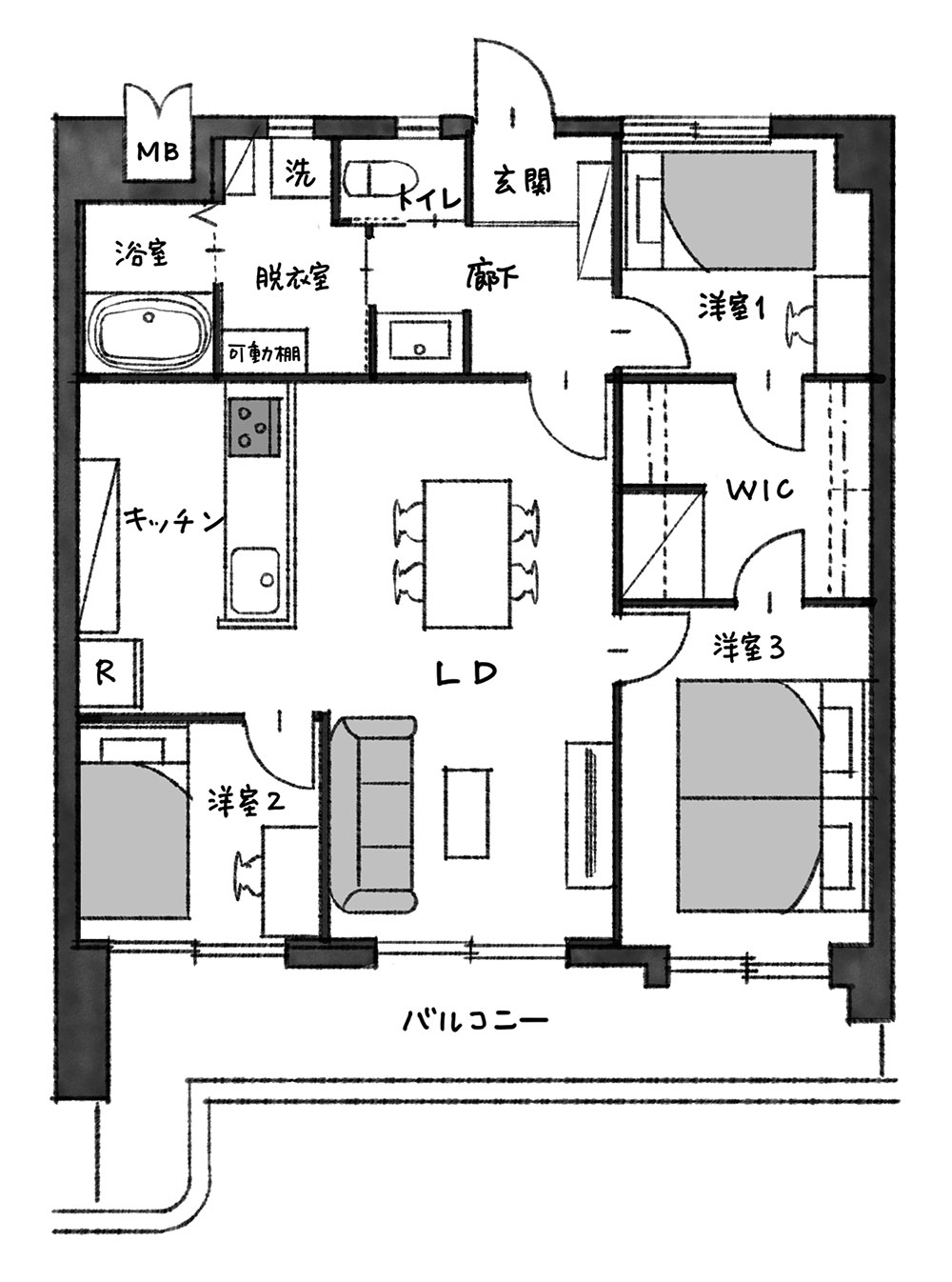 なだらかな丘陵地にあり、気持ちのいい光が入るLDKは、もちろん家族の笑顔が見られる対面キッチンに変更。また、各居室はコンパクトにまとめながらも、たくさんの荷物が収納できるウォークスルークローゼットを居室間にレイアウト。このおかげで、風通しの良い家族の空間が実現しました。