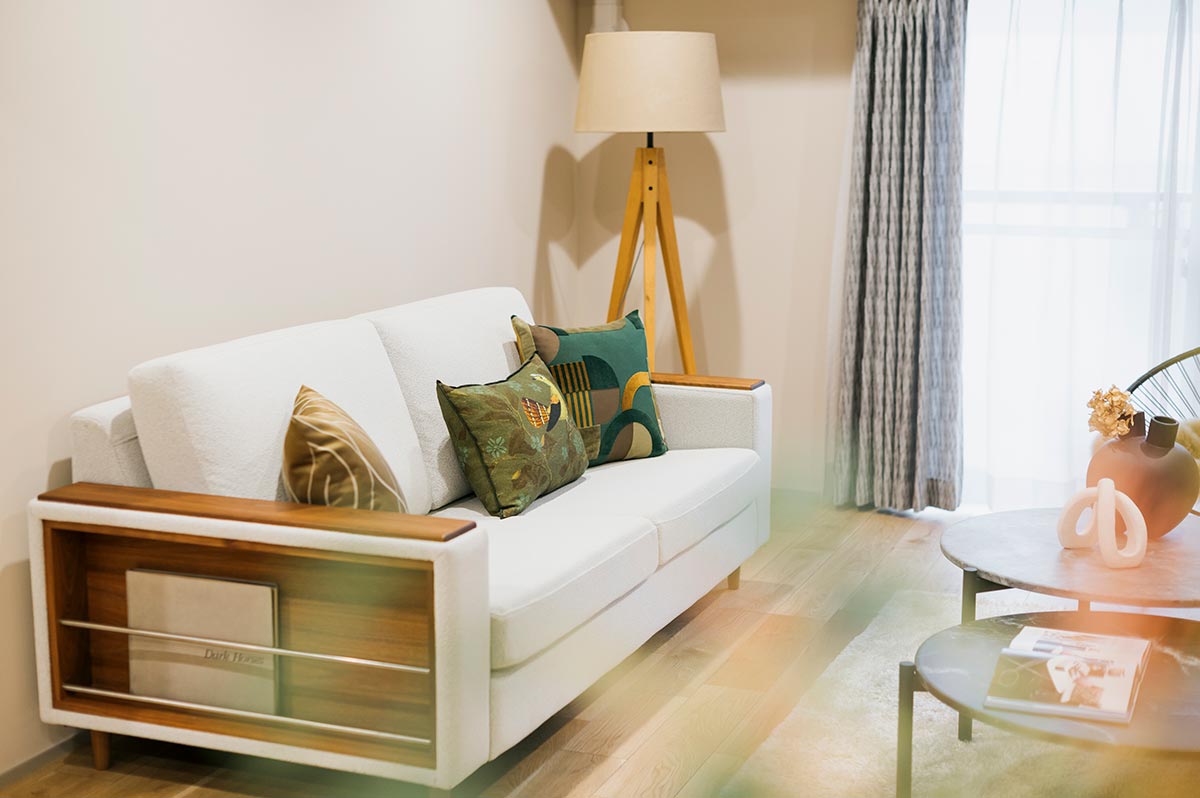 都心での暮らしを満喫できる立地ながらも、静かで日照の良い住空間が実現しました。元々は3LDKだった78㎡のお部屋を、これからの時代にマッチした2LDKへダウンサイジング。20帖を超えるゆとりのリビングが広がっています。