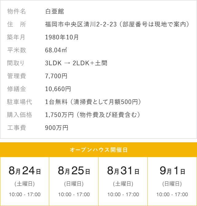 今回の物件費と工事費、その他の費用を合計するとかかった費用は2,650万円です。こだわりや遊びがたくさん詰まったお家が、近隣(薬院駅または渡辺通駅)の新築と比べるとやっぱり2/3程度のコストで済んでいます。