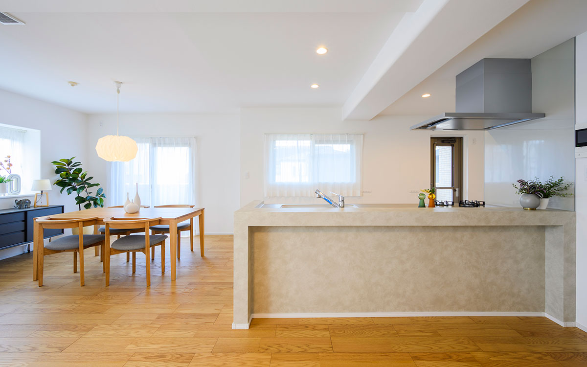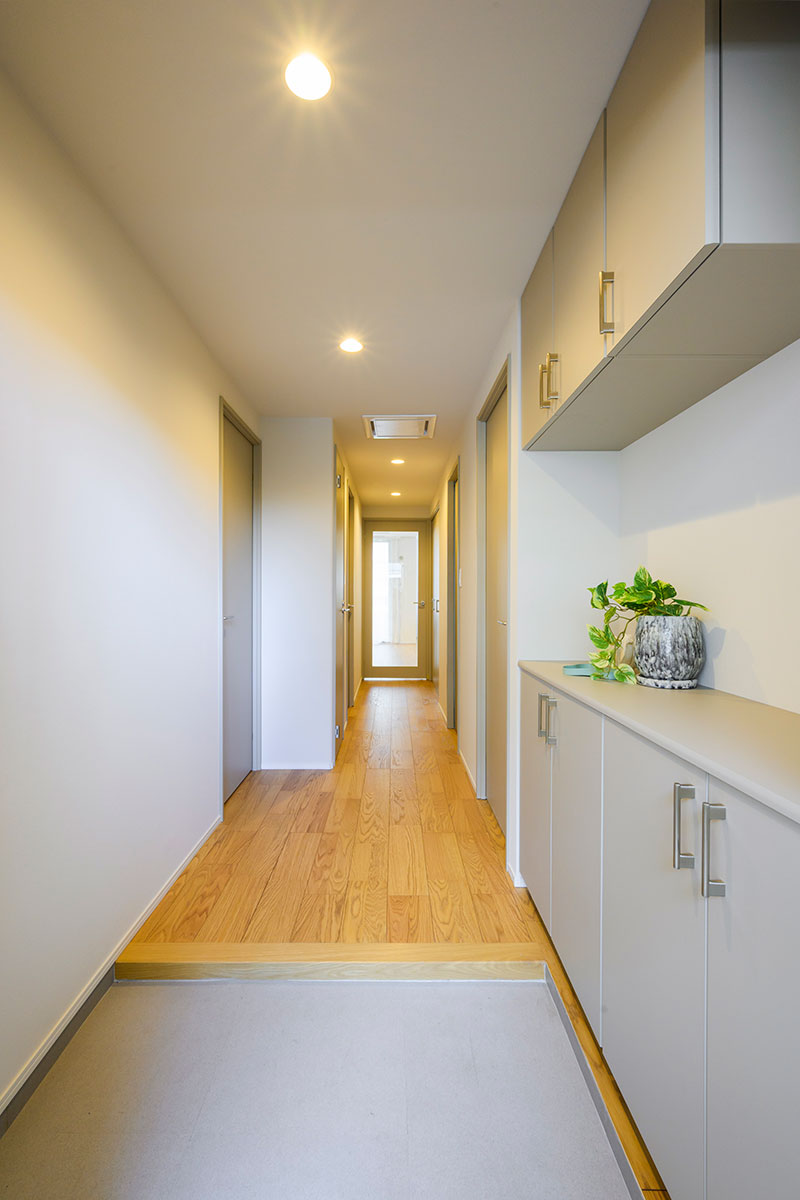 宅内のテイストはナチュラルモダンに統一。建具の色も人気のウォームグレーを採用することで、フローリングのオークの色味とマッチした空間が誕生しました。もちろん、はぴりの!ならではの「デザイン性」と「コスパ」を両立する仕組みもたくさん取り入れた現場です。