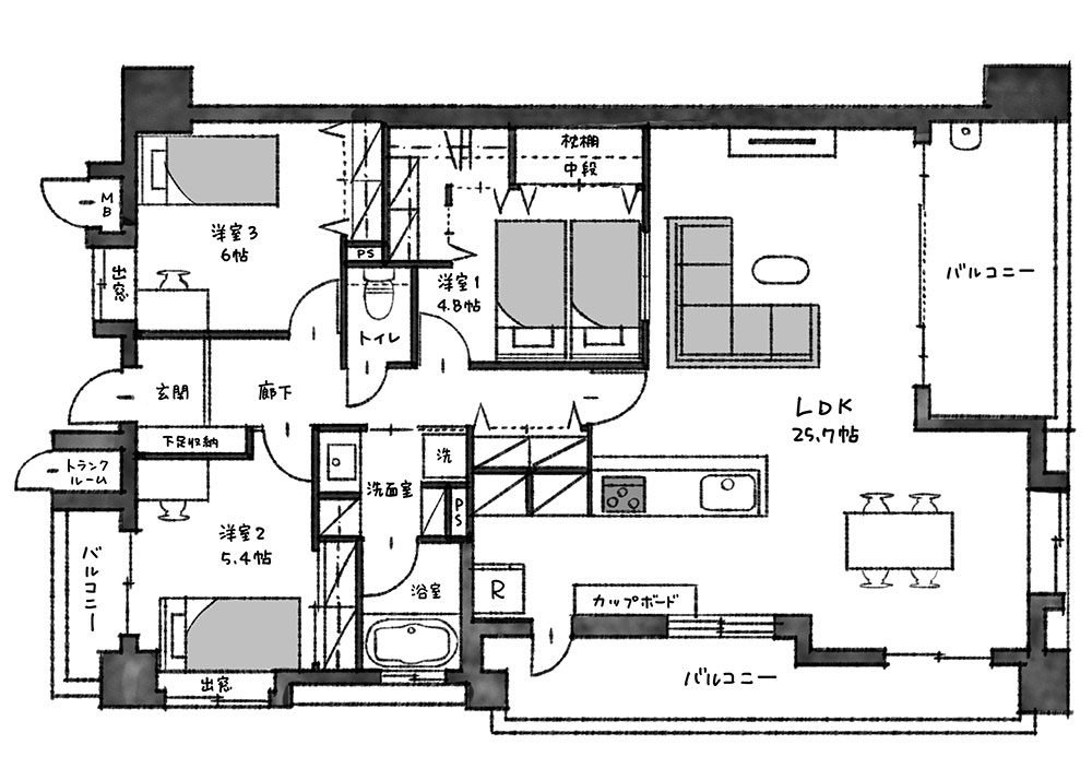新築マンションの平米数は、土地と建築費の高騰でどんどん狭くなっています。3LDKでも60㎡台が普通ですし、80㎡の広さがあれば4LDKで販売されることが最近では一般的です。