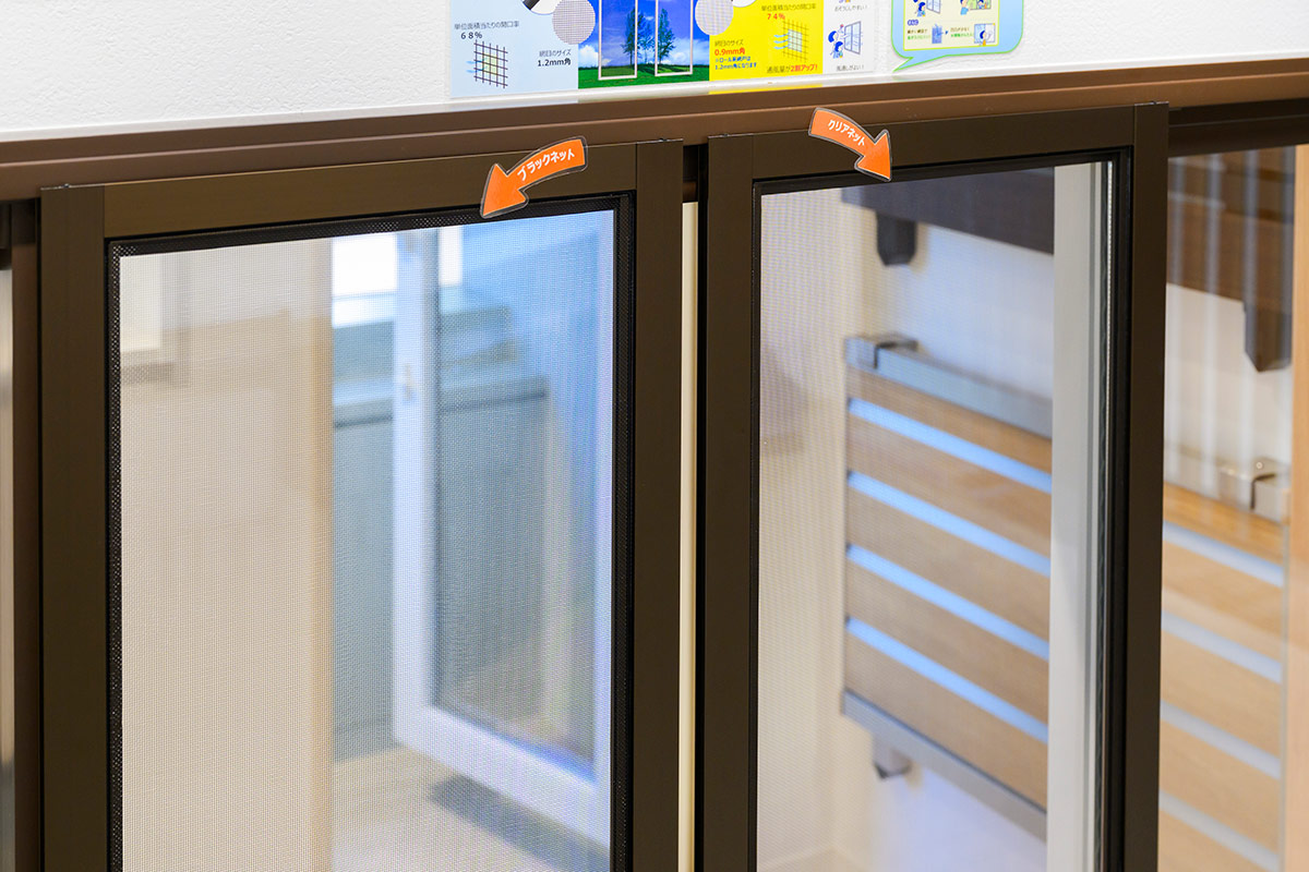 写真右は景色がクリアに見える「クリアネット」の網戸。