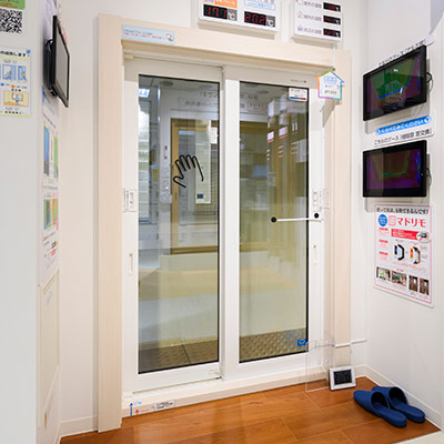 ショールームには、様々な種類の窓や網戸が展示されています。
