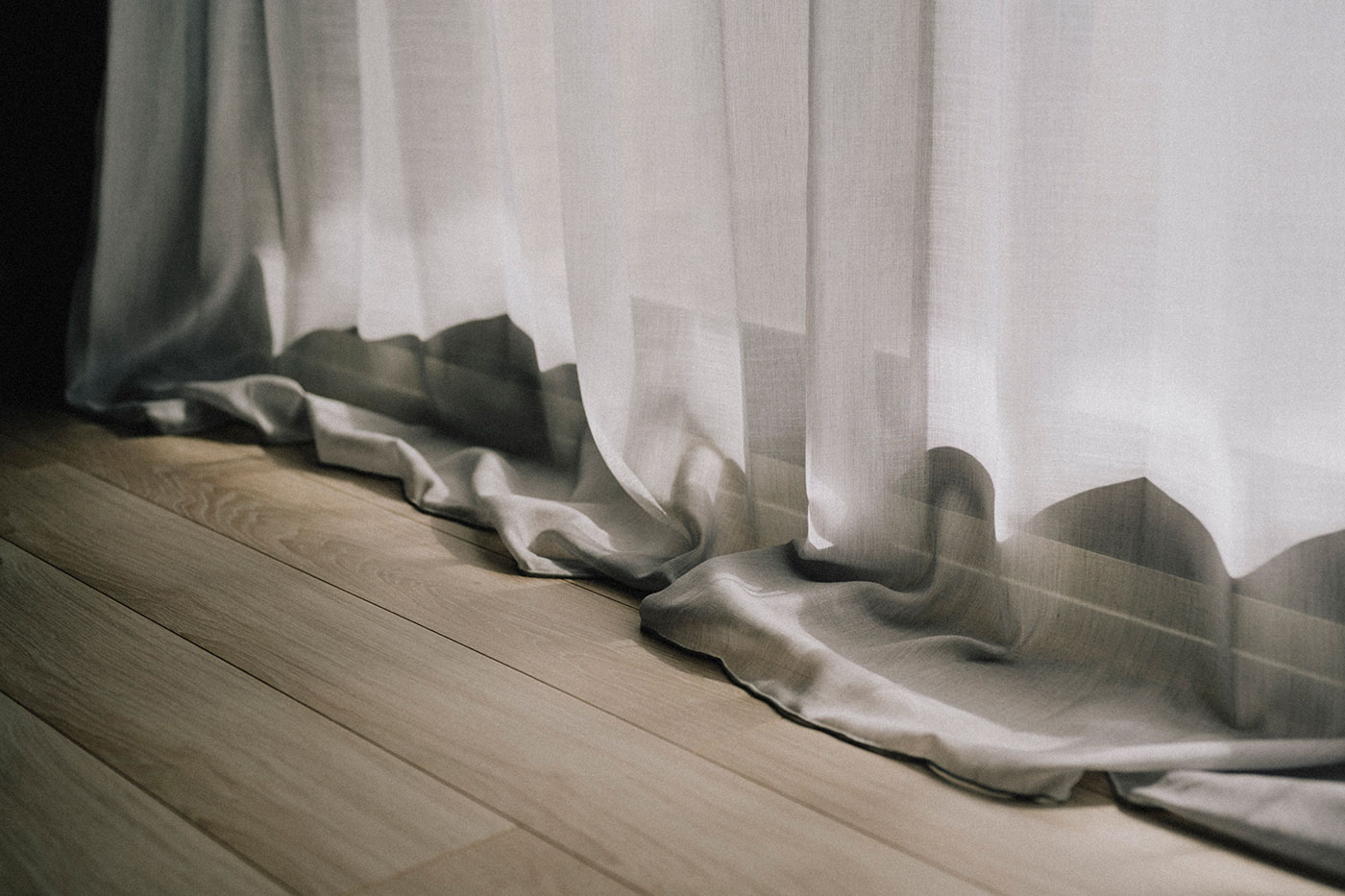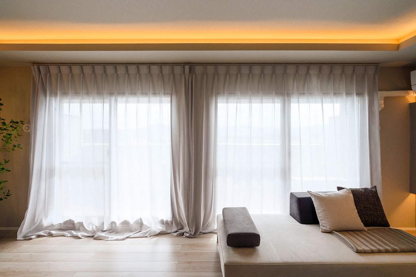 内窓を設置して断熱性能を向上(UA値 0.97→0.73)させたうえで、壁面全体にカーテンを設置。