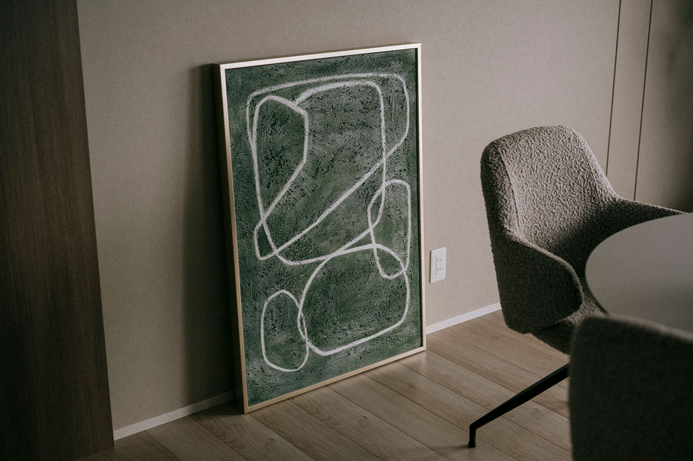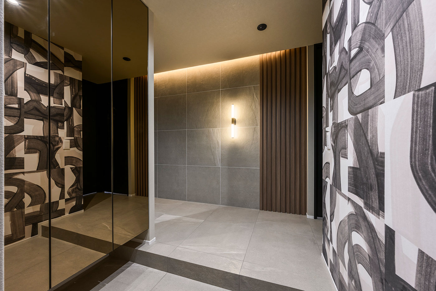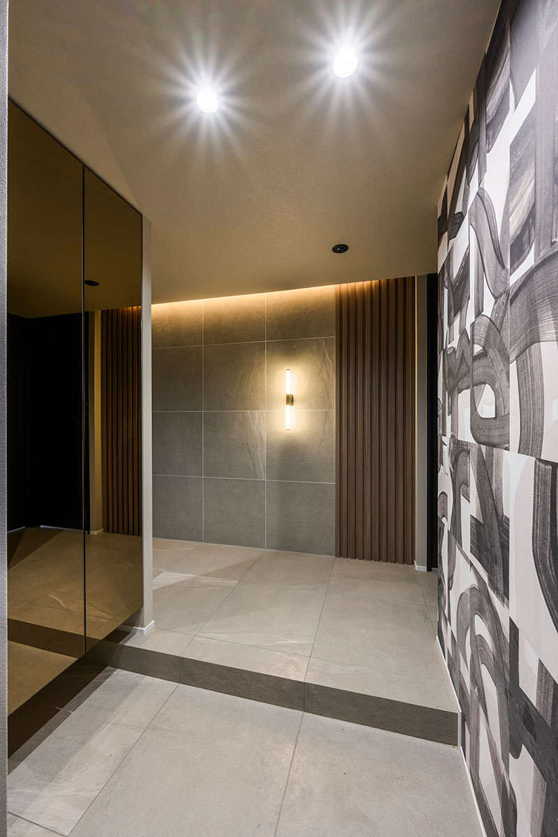 玄関に入るとまず目に飛び込んでくるのは、デザイン性の高い照明器具と壁面デコレーション。