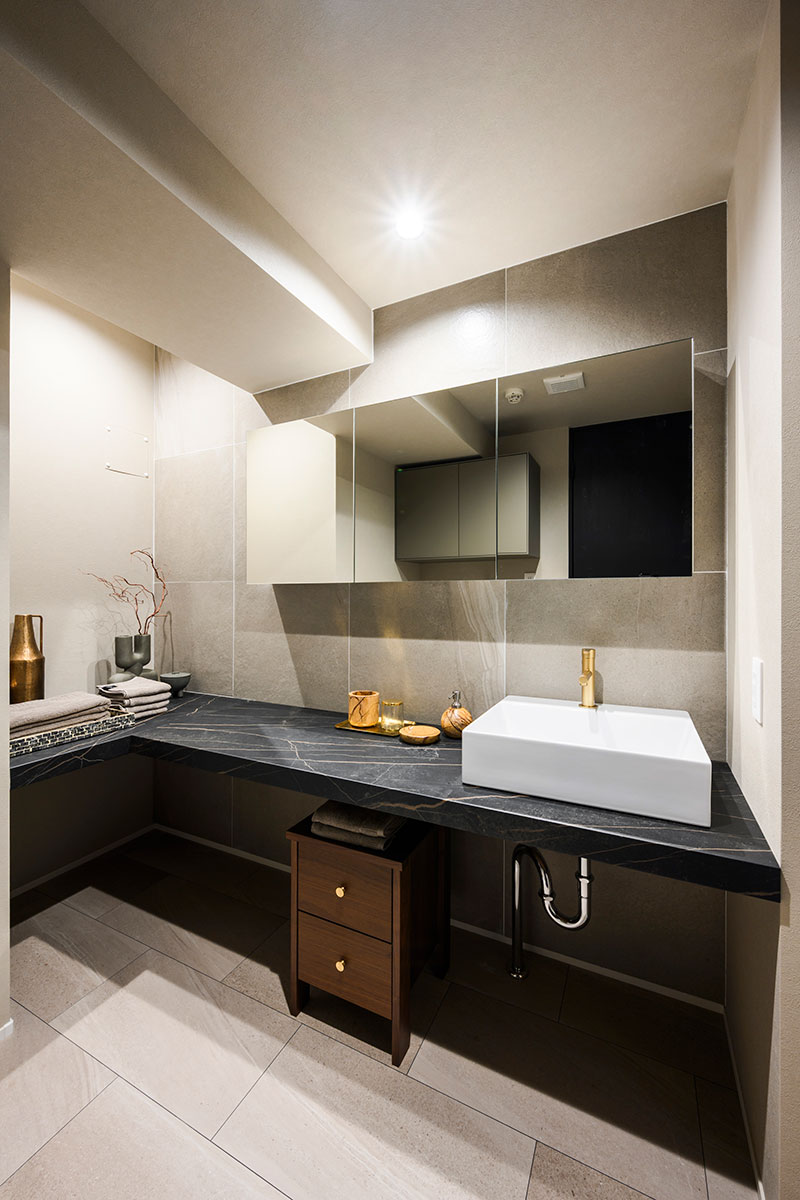 L型の造作カウンターによって、ホテルライクでオリジナリティの高い洗面室に。