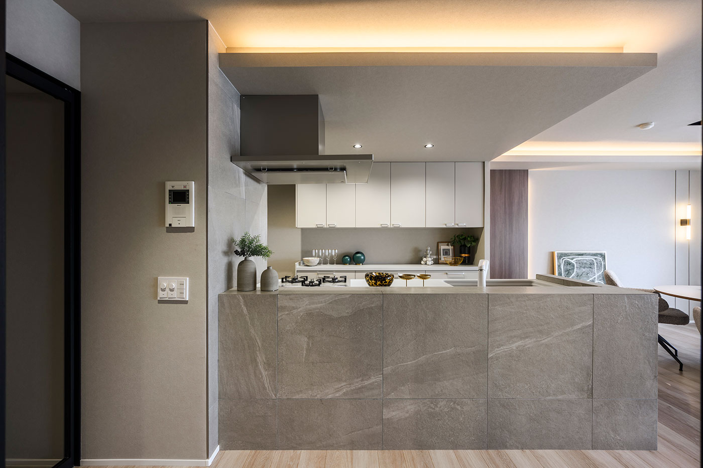 キッチンの前面にも大判タイルを貼ることで、空間全体に統一感を生み出している。