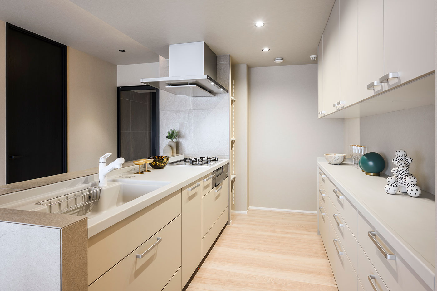 標準グレードのキッチンながら、ハイグレードな印象に仕上がった。