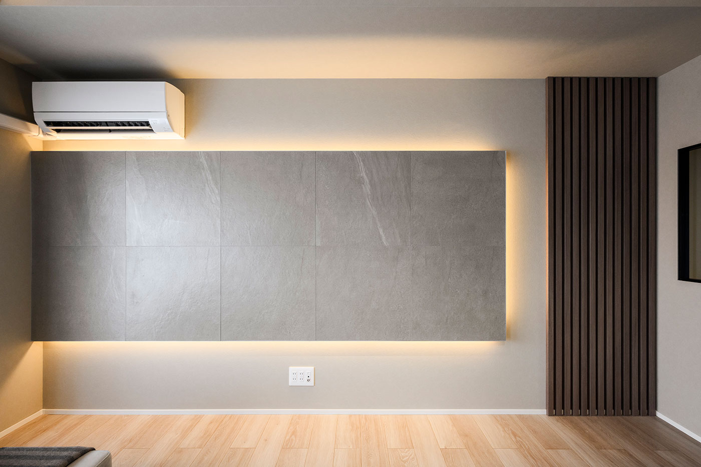 リビング壁面にも大判タイルを貼り、空間全体のデザイン性を高めている。