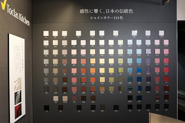 塗装技術だけでなく、色にも徹底的にこだわるのがトクラス流。キッチン扉のカラーは、なんと114種類もの豊富な色から選ぶことができます。