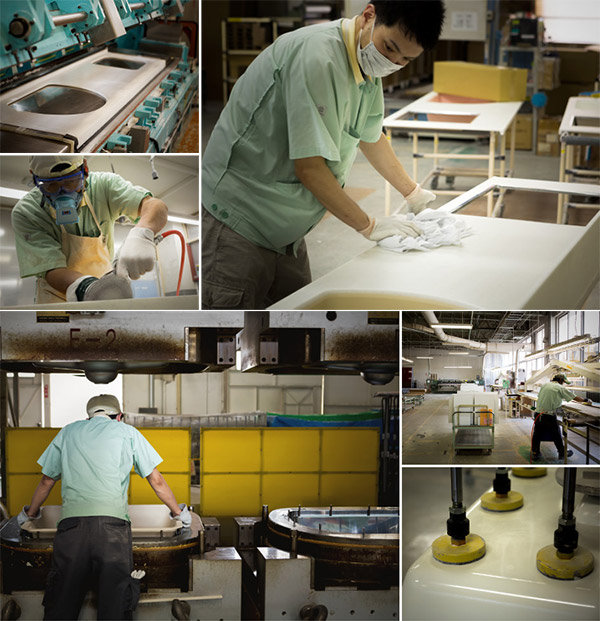通常、他のキッチンメーカーは人造大理石の素材を業者から仕入れてつくります。しかしトクラスは素材から自社で研究開発し、熱や汚れに強いオリジナルの人造大理石をつくっているのです。